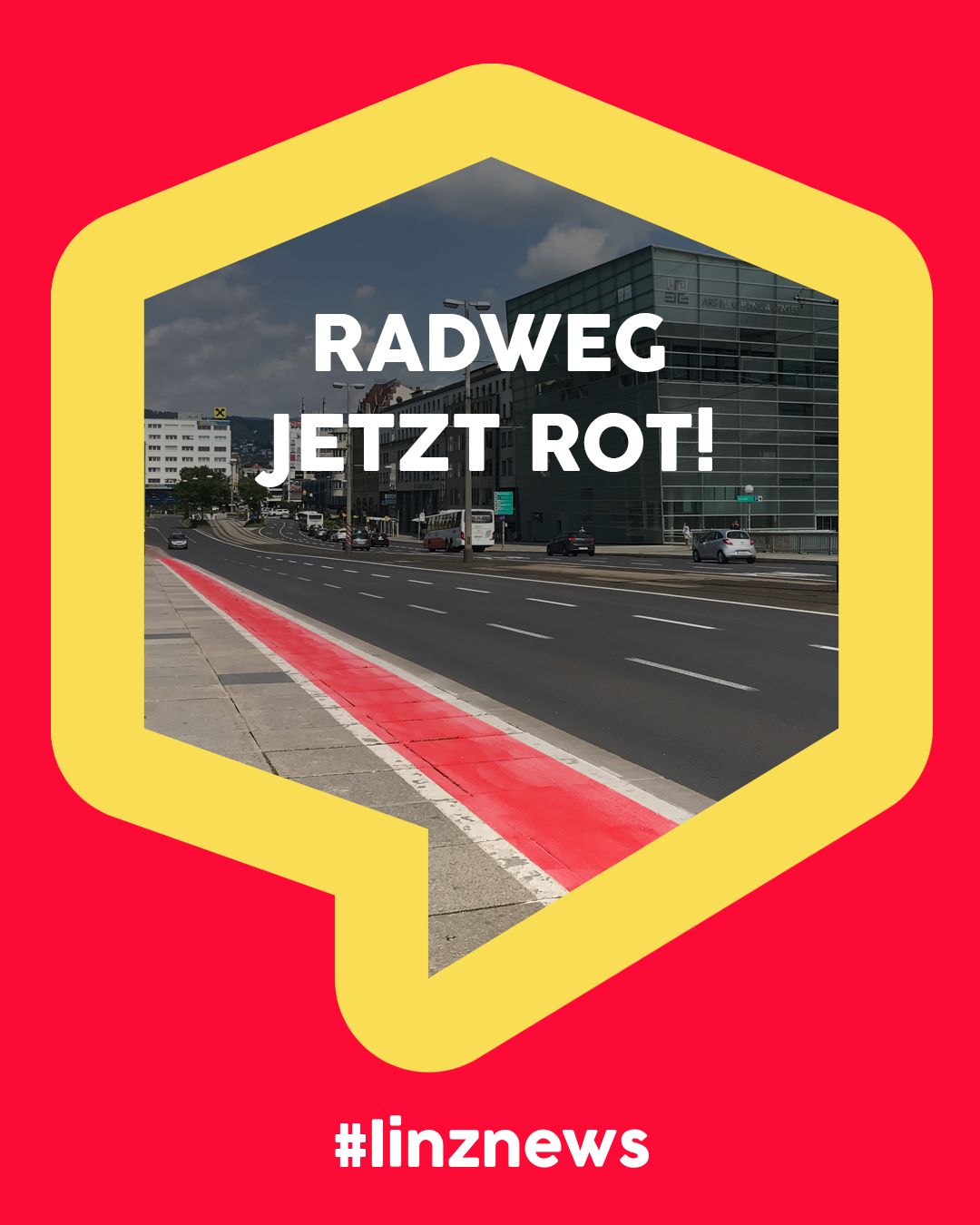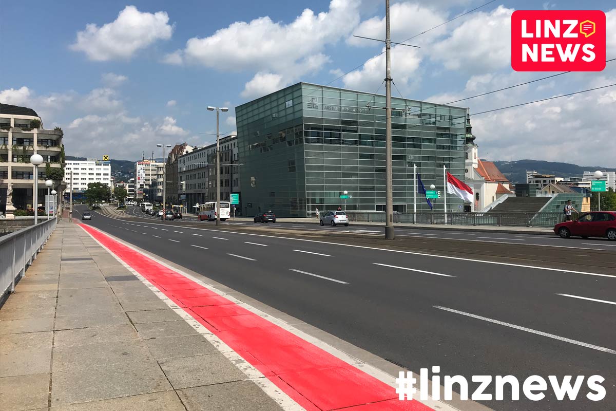 Der Radweg über die Linzer Nibelungenbrücke ist nun in roter Farbe gehalten. Die bessere Erkennbarkeit der Radstreifen soll Sichtbarkeit und vor allem Sicherheit fördern.