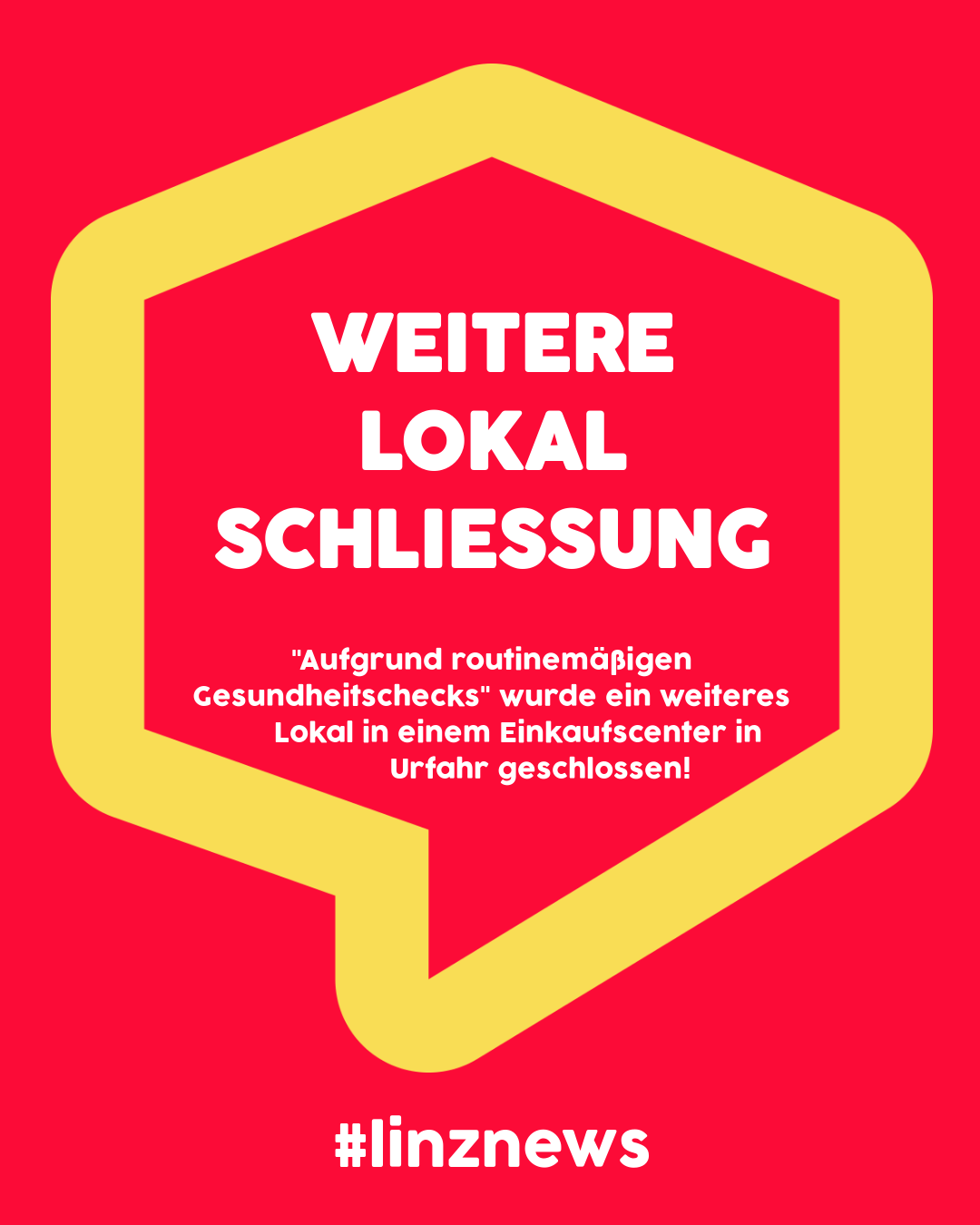 “Aufgrund routinemäßigen Gesundheitschecks” wurde ein weiteres Lokal in einem Einkaufscenter in Urfahr geschlossen! Laut Aushang ist der Centerbetreiber bemüht das beliebte Lokal rasch wieder zu öffnen!