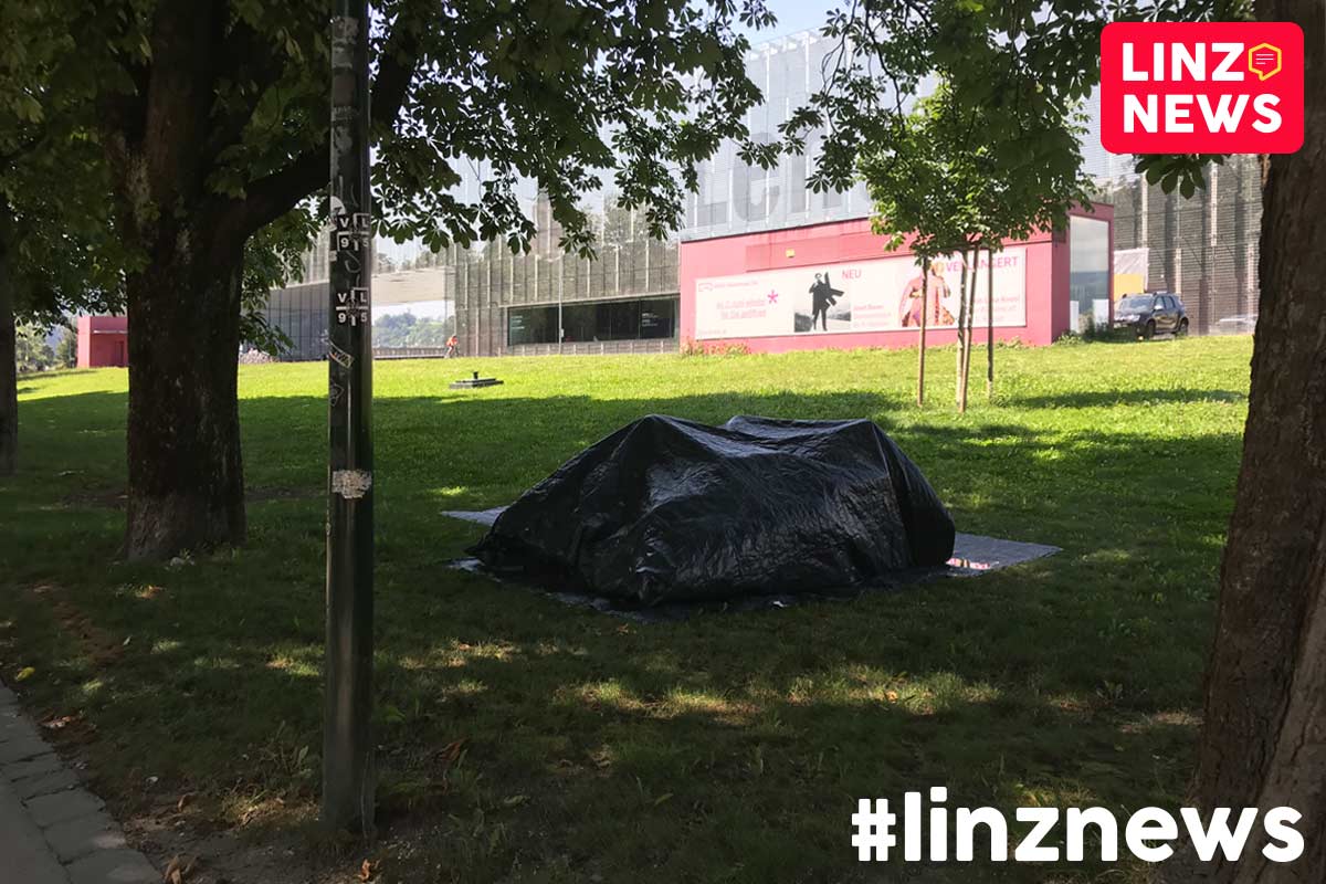 Seit einigen Monaten – zumindest seit Mai – wohnt vor dem Kunstmuseum Lentos ein Mann mitten im Linzer Donaupark.