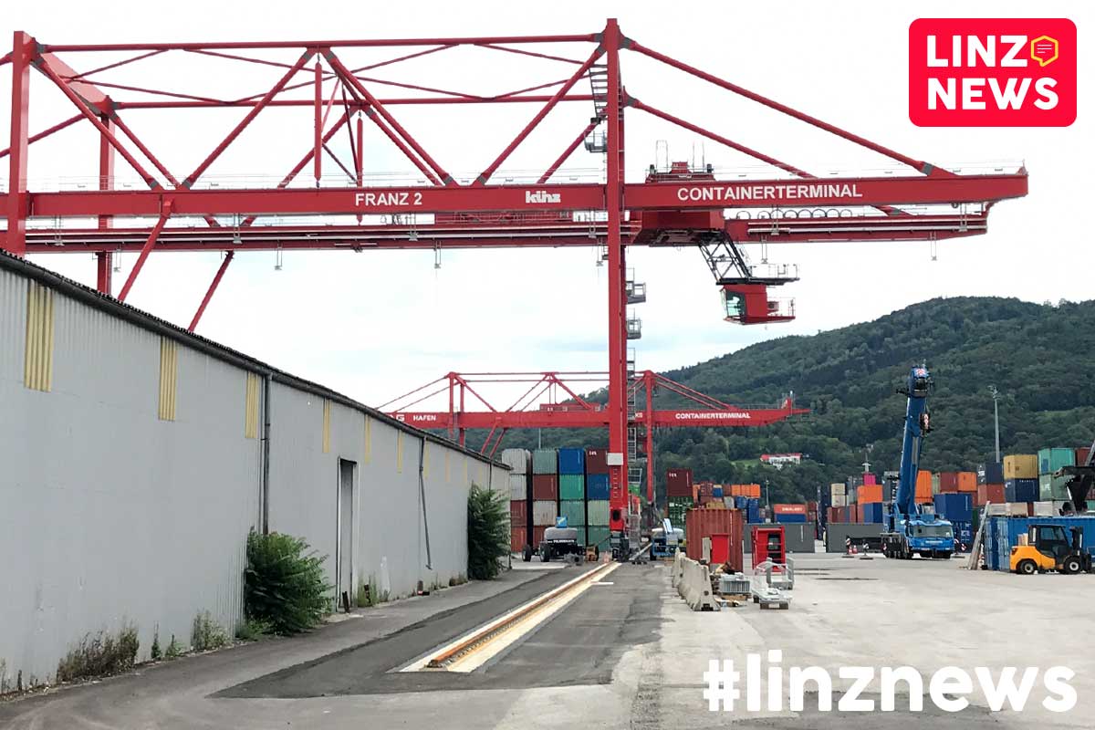 Linz. Zweiter Containerportalkran im Containerterminal steht.