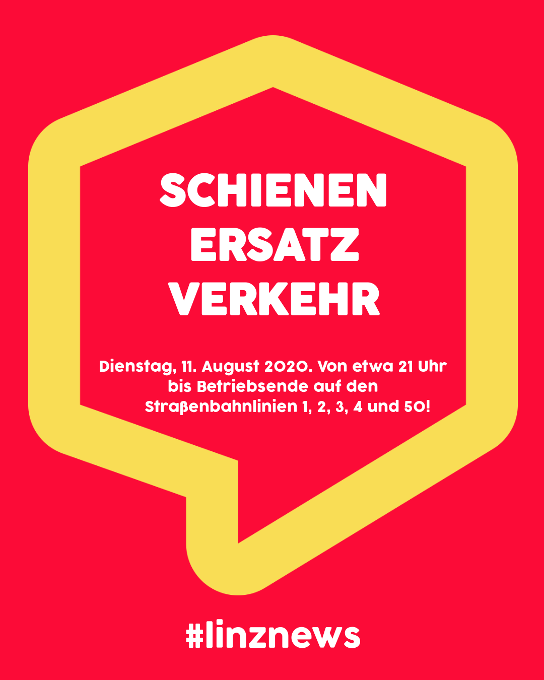 LNZ. Notwendige Gleisarbeiten im Bereich Schmidtorstraße führen zu einer Verkehrsunterbrechung am Dienstag, 11. August 2020, von etwa 21 Uhr bis Betriebsende auf den Straßenbahnlinien 1, 2, 3 und 4 zwischen den Haltestellen Hauptbahnhof und Sonnensteinstraße bzw. Landgutstraße und auf der Linie 50 zwischen den Haltestellen Hauptplatz und Landgutstraße.