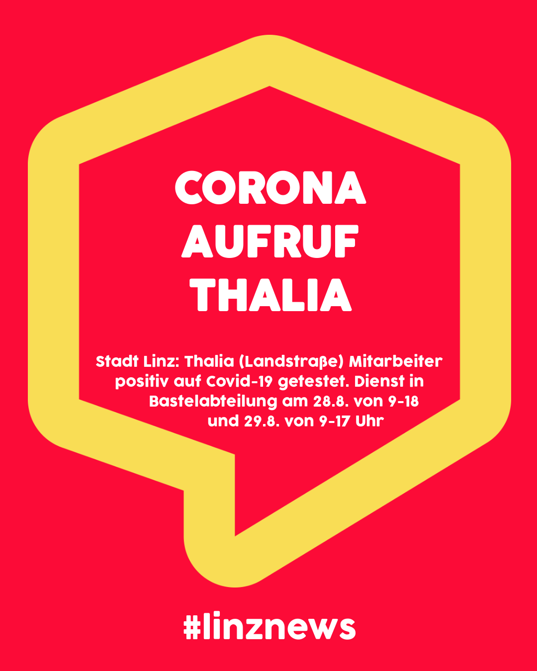 LINZ. Die Gesundheitsbehörde der Stadt Linz informiert: Eine beim Thalia-Store an der Linzer Landstraße beschäftigte Person wurde positiv auf Covid-19 getestet. Sie war am Freitag, 28. und Samstag, 29. August in der Bastelabteilung im Untergeschoß tätig.