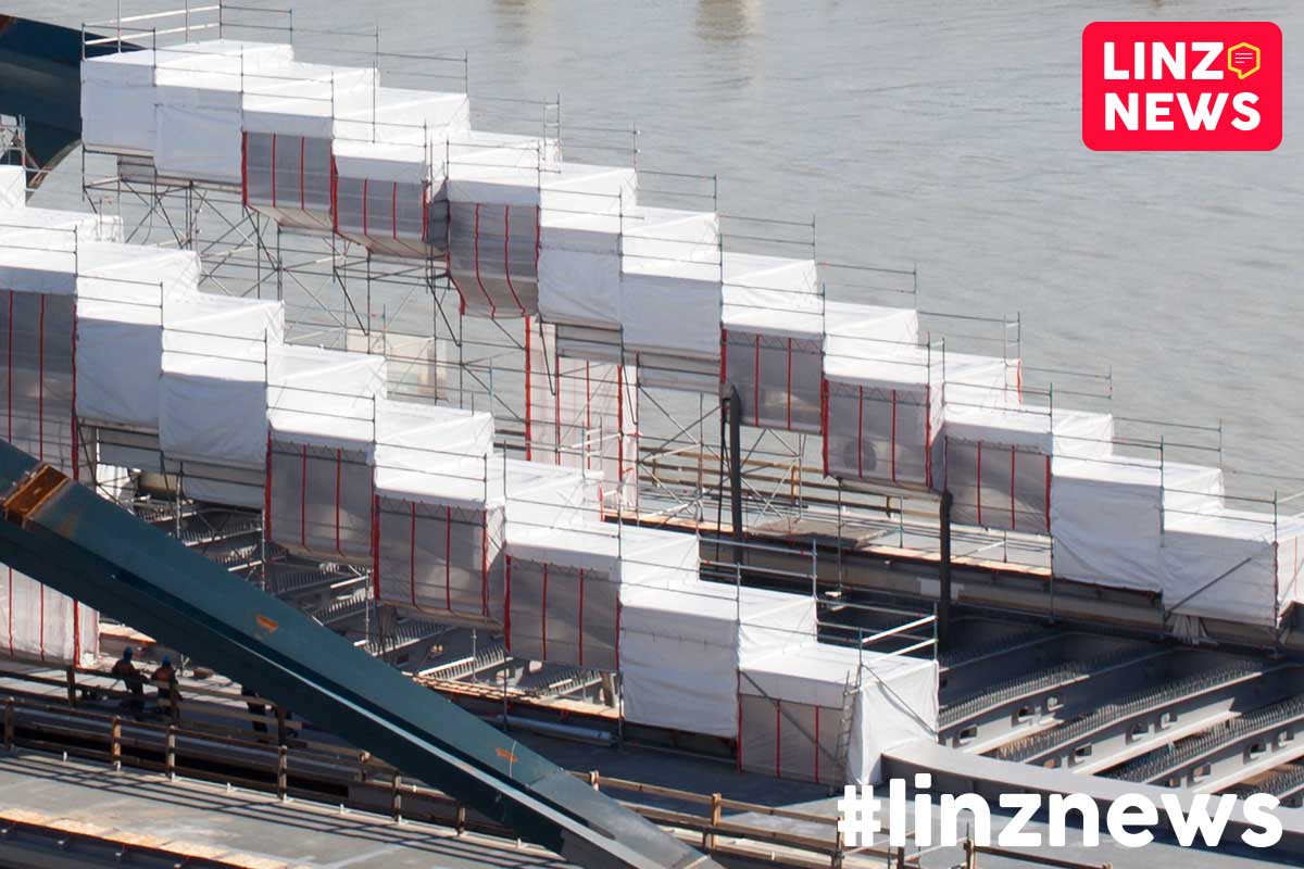 Urfahr hat jetzt eine “Himmelsstiege”! Die Treppe entsteht derzeit auf den Bögen der Neuen Donaubrücke und hält Planen. Die Folie dient dem Schutz der Umwelt vor Rückständen vom Lackieren der Brückenteile.