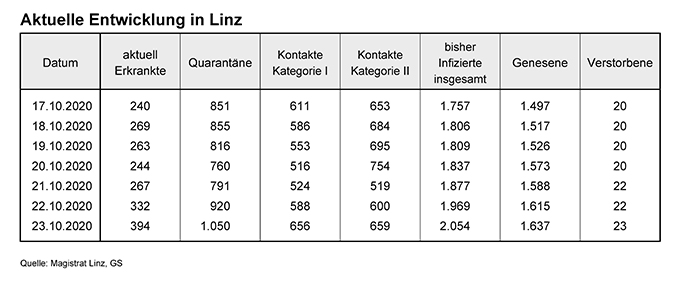 Im Linzer Magistrat wird ab sofort in geteilten Schichten gearbeitet. Dies hat die teilweise Aktivierung von Homeoffice zur Folge. Alle Besprechungen mit größerer Teilnehmerzahl werden nur mehr per Videokonferenz abgehalten. Sämtliche Veranstaltungen der Stadt Linz sind bis Weihnachten abgesagt (etwa Ehrenauszeichnungen).