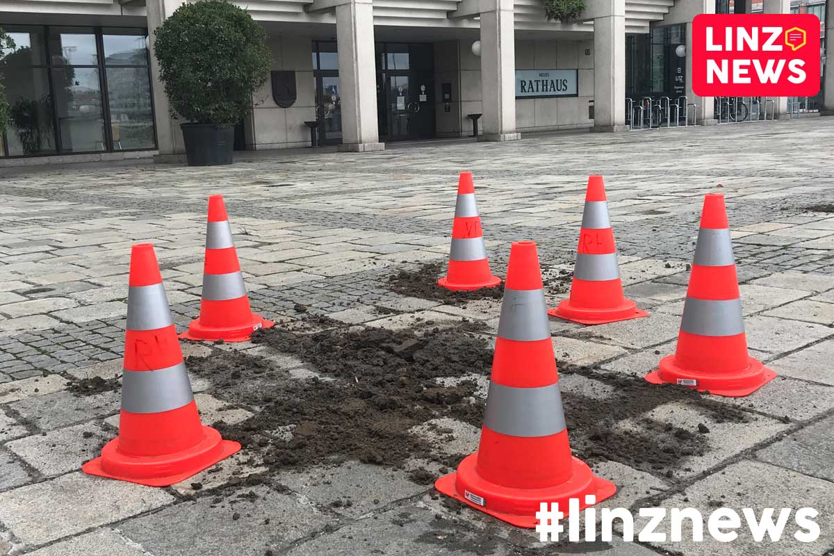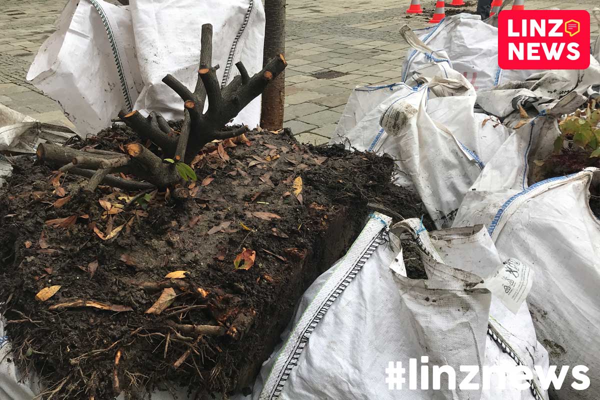 Die Gehölzpflege am Neuen Rathaus in Urfahr geht weiter. Am Vorplatz des Rathauses lagern gerodete Sträucher und ganze Wurzelstöcke kleiner Bäume.
