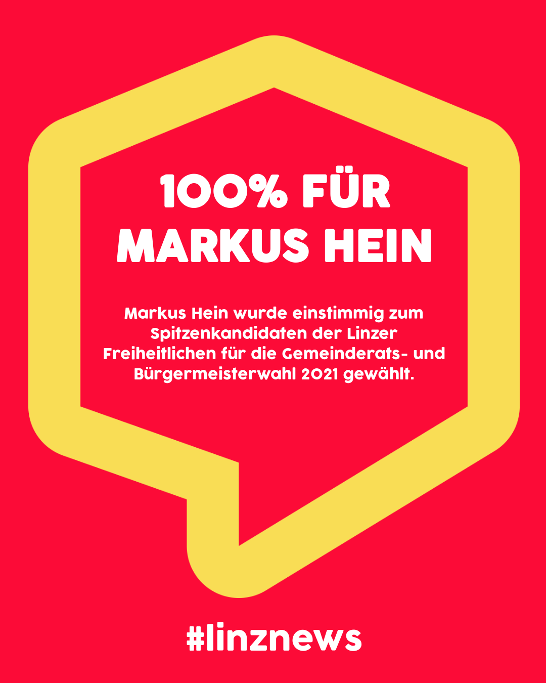 „Ich gratuliere der Linzer FPÖ zu dieser Entscheidung. Durch seine konsequente Sacharbeit der letzten Jahre hat Markus Hein bewiesen, dass er die Stimme der Vernunft und daher der logische und richtige Spitzenkandidat für Linz ist. Mit ihm an der Spitze einer starken FPÖ ist garantiert, dass die Lebensbedingungen der Bürger im Vordergrund stehen und die Interessen der Österreicher in der Landeshauptstadt gewahrt bleiben“, gratuliert auch der freiheitliche Landesparteiobmann LH-Stv. Manfred Haimbuchner zur Ernennung.