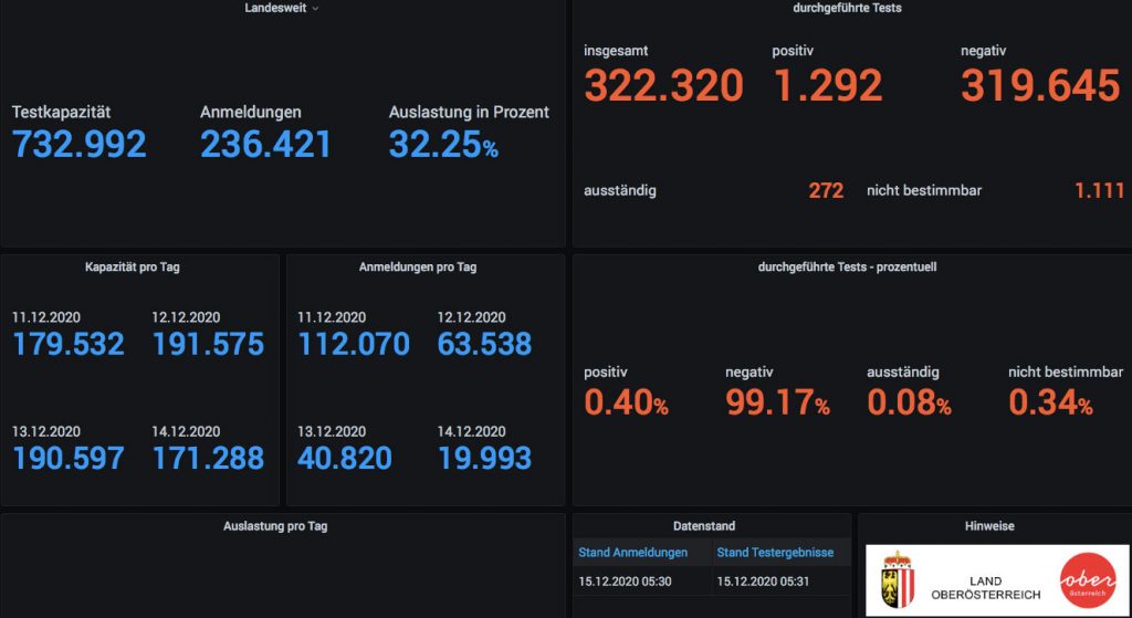 Von 1.490.279 Oberösterreichern galten rund 1,2 Millionen als mögliche Testpersonen. Insgesamt kamen an den 4 Testtagen aber nur rund 25,2 Prozent der “testfähigen” Bevölkerung zum Massentest. Die Auslastung der Testkapazität lag bei 32.25 Prozent.
