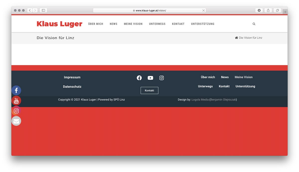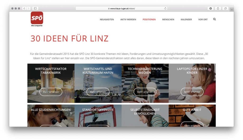 Der Menüpunkt “Meine Visionen” des Stadtchefs führt zu einer leeren Unterseite. Ein sogenanntes “Inlineframe” zeigte dann allerdings nach einiger Zeit “30 IDEEN FÜR LINZ” der SPÖ Linz an.