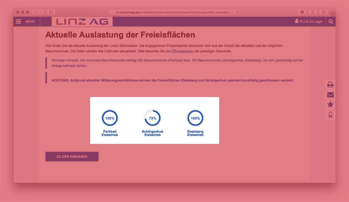Die Ferien starteten für viele Jugendliche augenscheinlich mit Eislaufen. Laut Website der Linz AG lag am Nachmittag die Auslastung der Anlagen zwischen 73 und 100%.