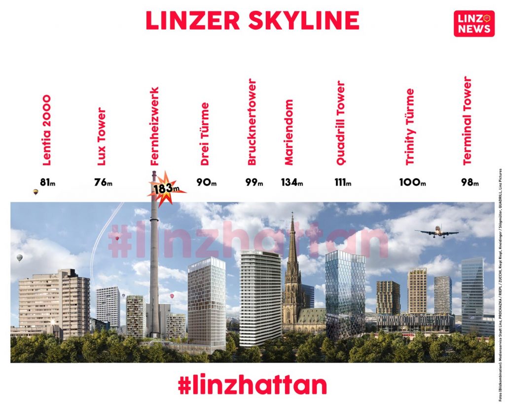 Die Linzer Wolkenkratzer im Vergleich zum höchsten Bauwerk (Kamin Fernheizwerk) und dem Mariendom.
