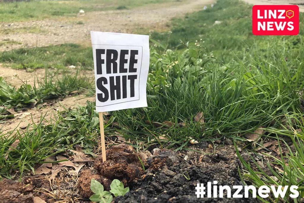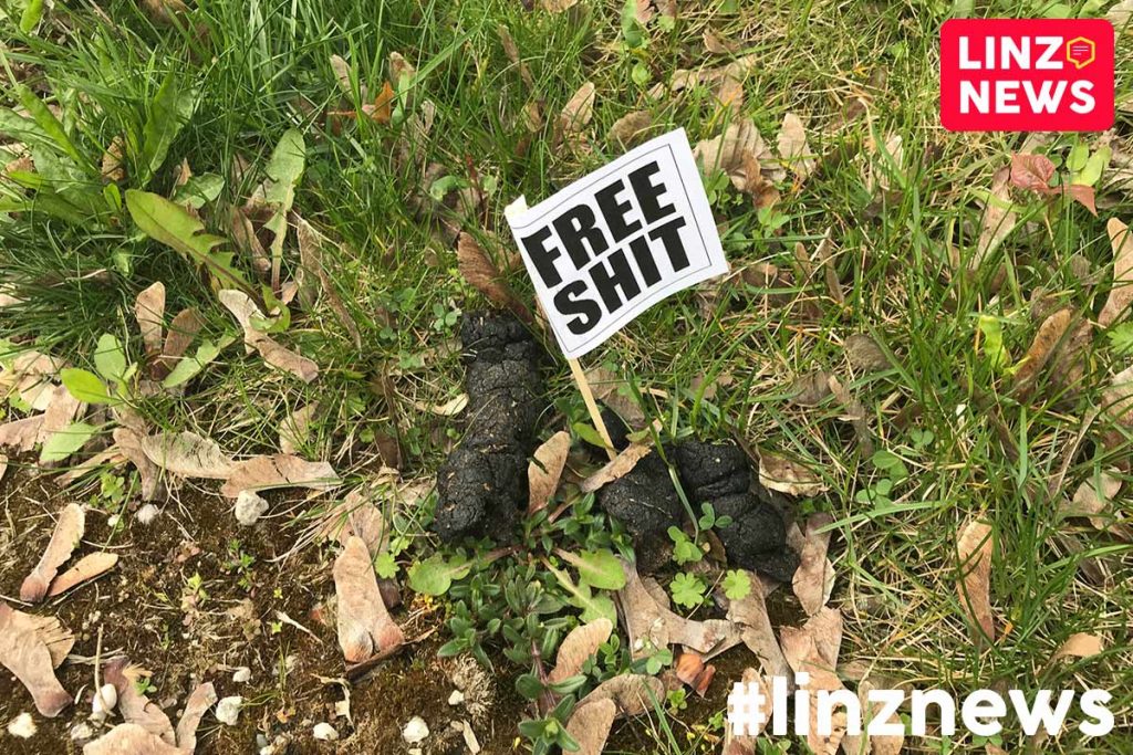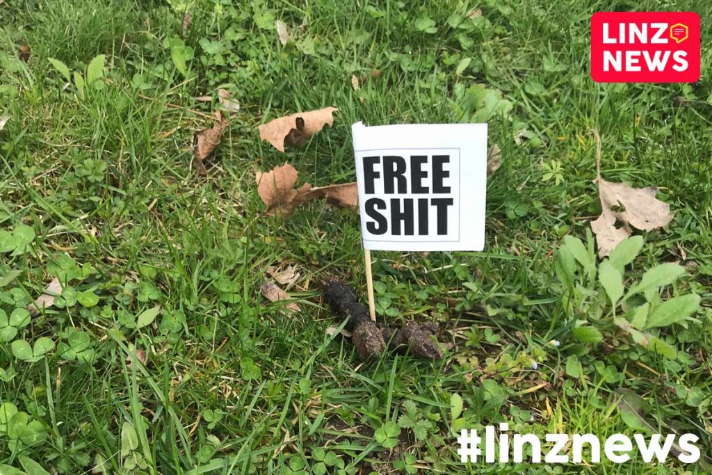 Pfui! Neuer Trend in Linz. Hundehaufen kommen immer öfter nicht mehr in das Sackerl. Stattdessen werden die kleinen Hauferl mit “Free Shit”-Fähnchen geschmückt.