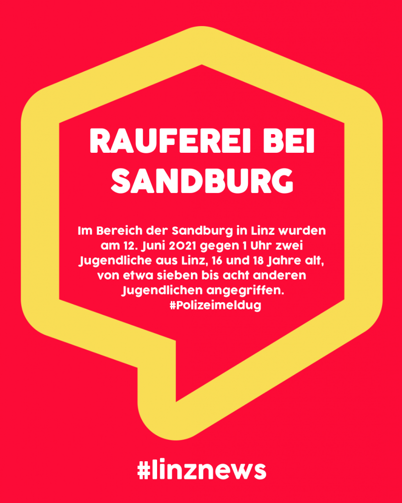 Im Bereich der Sandburg in Linz wurden am 12. Juni 2021 gegen 1 Uhr zwei Jugendliche aus Linz, 16 und 18 Jahre alt, von etwa sieben bis acht anderen Jugendlichen angegriffen. Während der verbalen Auseinandersetzung kam es schließlich zum tätlichen Übergriff mehrere Personen auf die beiden Jugendlichen. Diese wurden dabei unbestimmten Grades verletzt. Die Fahndung nach den Tätern verlief ergebnislos.
