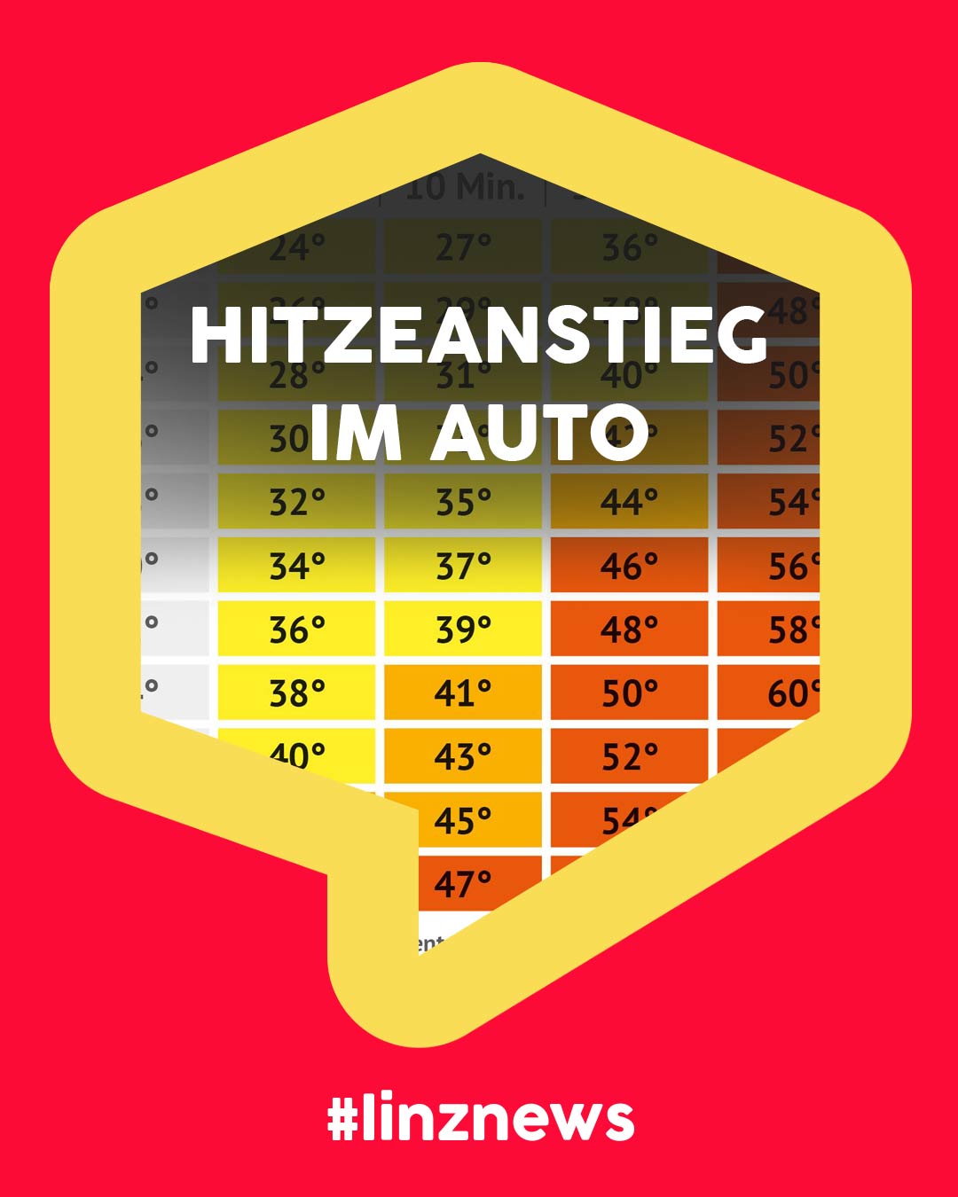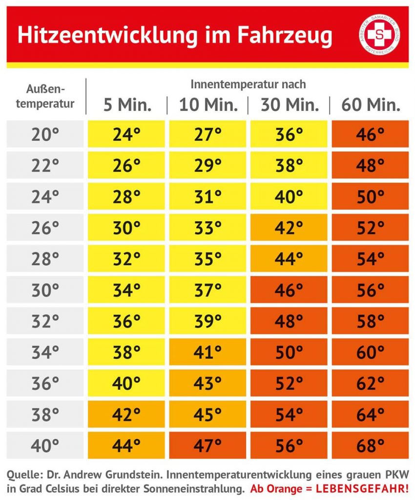 Hitzewelle im Zentralraum! Der Samariterbund Oberösterreich hat eine übersichtliche Tabelle zur Temperaturentwicklung in abgestellten Fahrzeugen zusammengestellt.