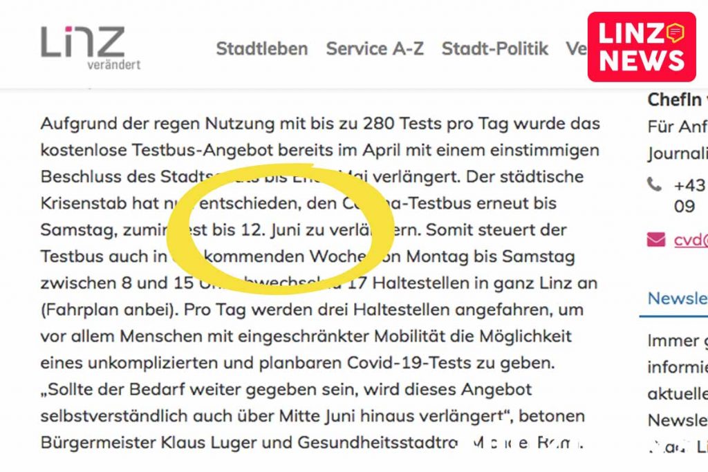 Das durchaus gut genutzte Angebot des Corona-Testbus im Linzer Stadtgebiet wurde am Freitag – wie berichtet – verlängert. Die offizielle Verlängerung laut Aussendung gilt bis zum 12. Juni. Bei Bedarf würde das Angebot selbstverständlich auch über Mitte Juni hinaus verlängert werden, betonten Bürgermeister und Gesundheitsstadtrat.