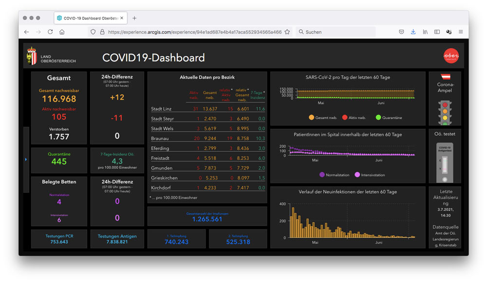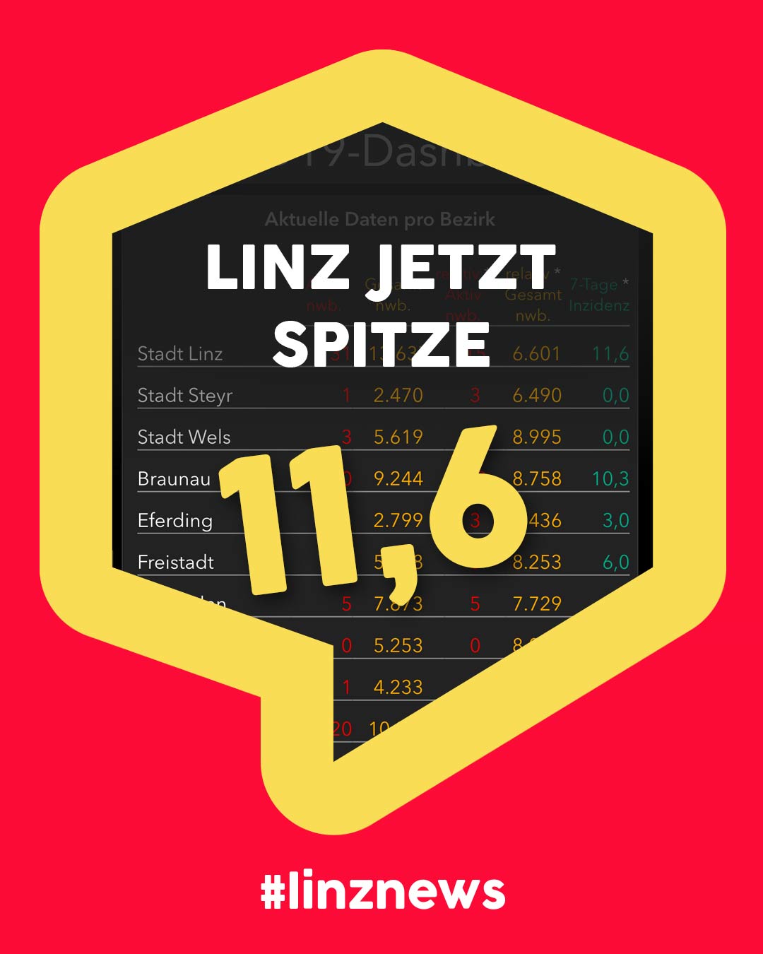 Linz hat derzeit eine 7-Tage Inzidenz pro 100.000 Einwohner von 11,6 und ist damit klarer Spitzenreiter in Oberösterreich. In den Bezirken Schärding, Perg, Kirchdorf, Stadt Wels und Stadt Steyr steht die Null!