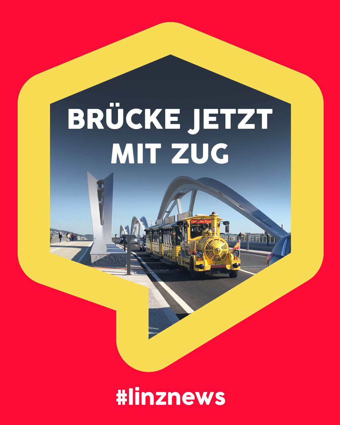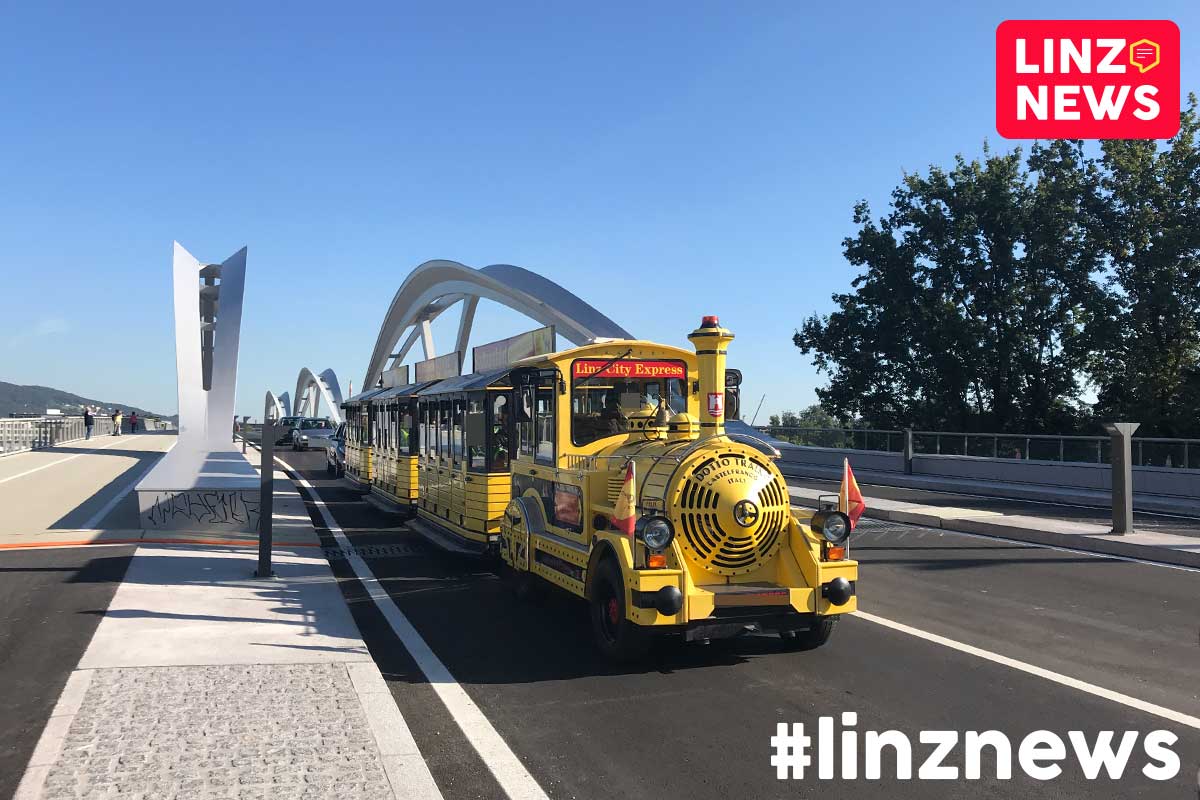 Eine Eisenbahnbrücke ohne Zug. Das gibt es – oder besser gesagt gab es – nur in Linz. Doch jetzt fährt statt der jahrelang plakatierten und auch auf den Bautafeln präsentierten Straßenbahn immerhin ein kleiner Zug.