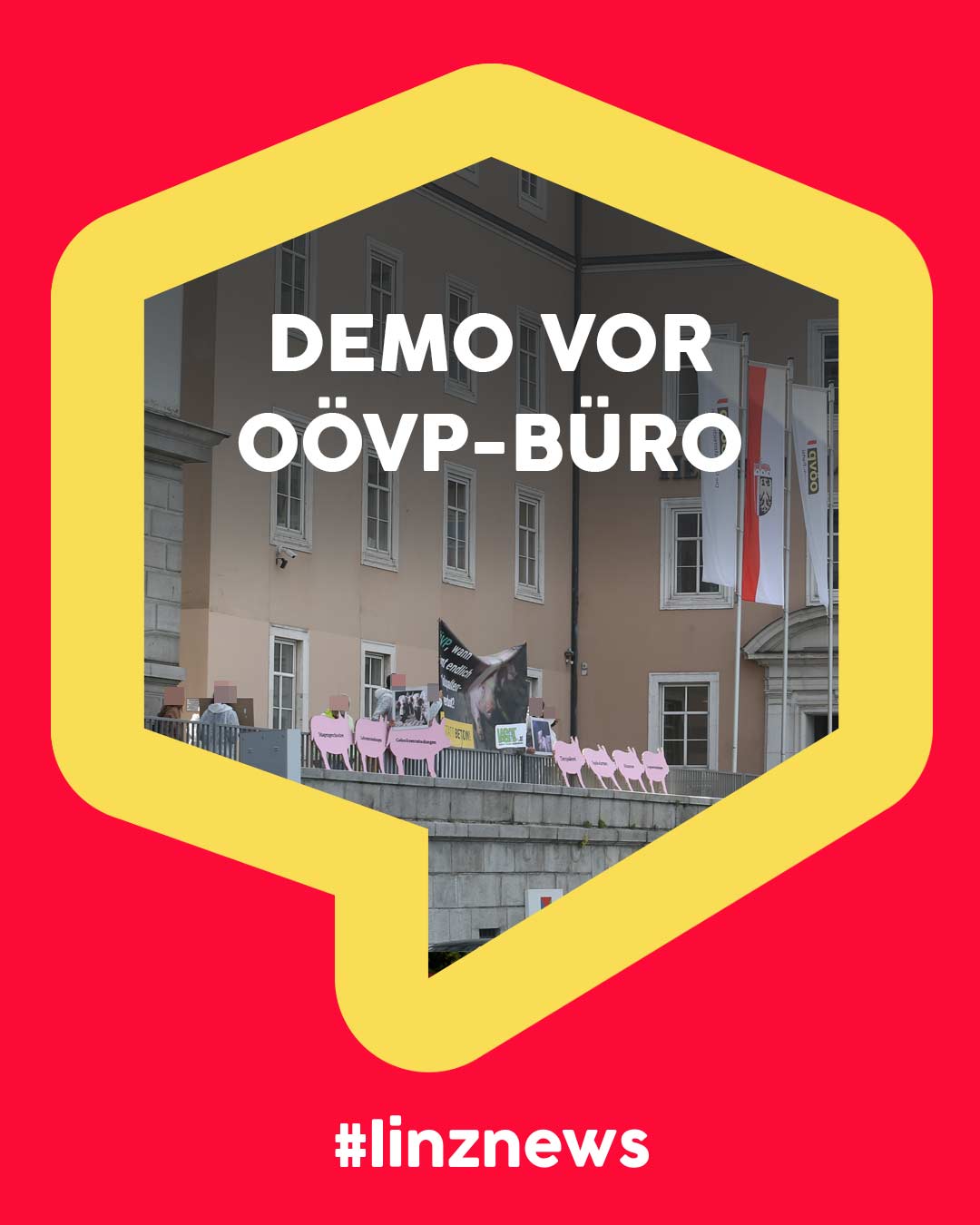 Heute gab es einen Protest vor dem Parteibüro der OÖ Volkspartei. Laut Tierschützer hat die OÖVP einen Entschließungsantrag der Grünen für ein Verbot von Vollspaltenböden in der Schweinezucht abgelehnt.