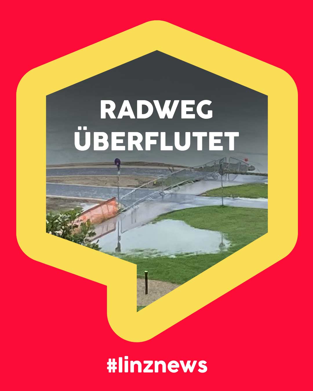 Die intensiven Regenfälle haben den derzeit in Renaturierung befindlichen Bauplatz der neuen Eisenbahnbrücke ordentlich unter Wasser gesetzt. Am Radweg entlang der Baustelle steht auch bereits das Wasser.