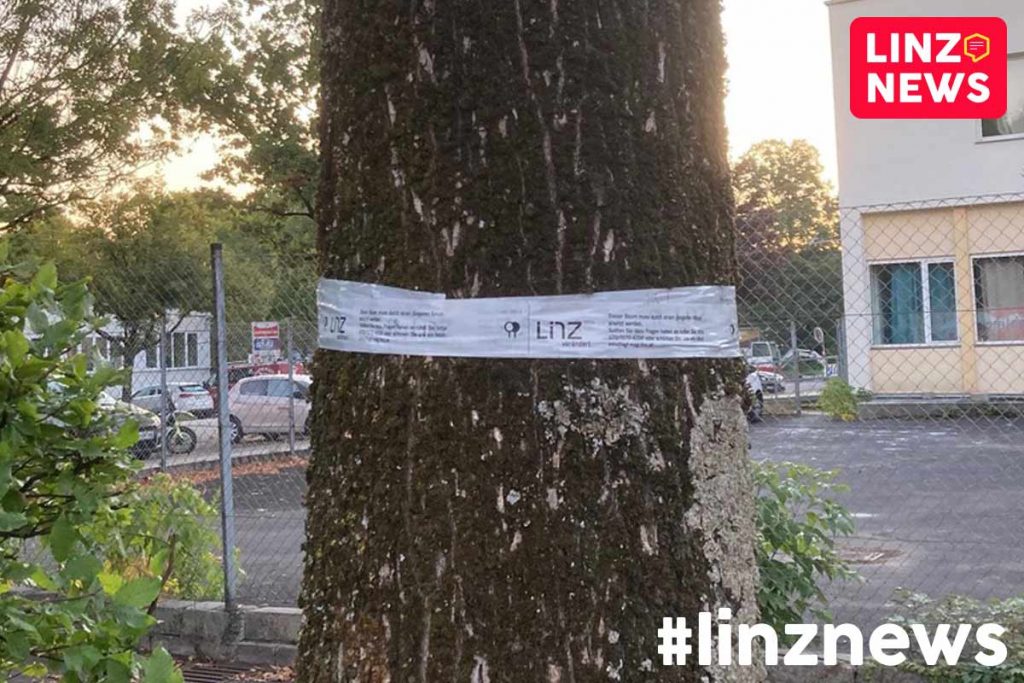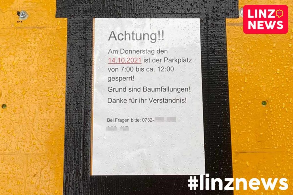 Im Herbst fallen nicht nur Blätter. In Linz fallen wieder ganze Bäume. So auch diese zwei Exemplare bei der BH Urfahr. Laut Aushang wird dafür morgen sogar 5 Stunden lang der gesamte Parkplatz gesperrt.
