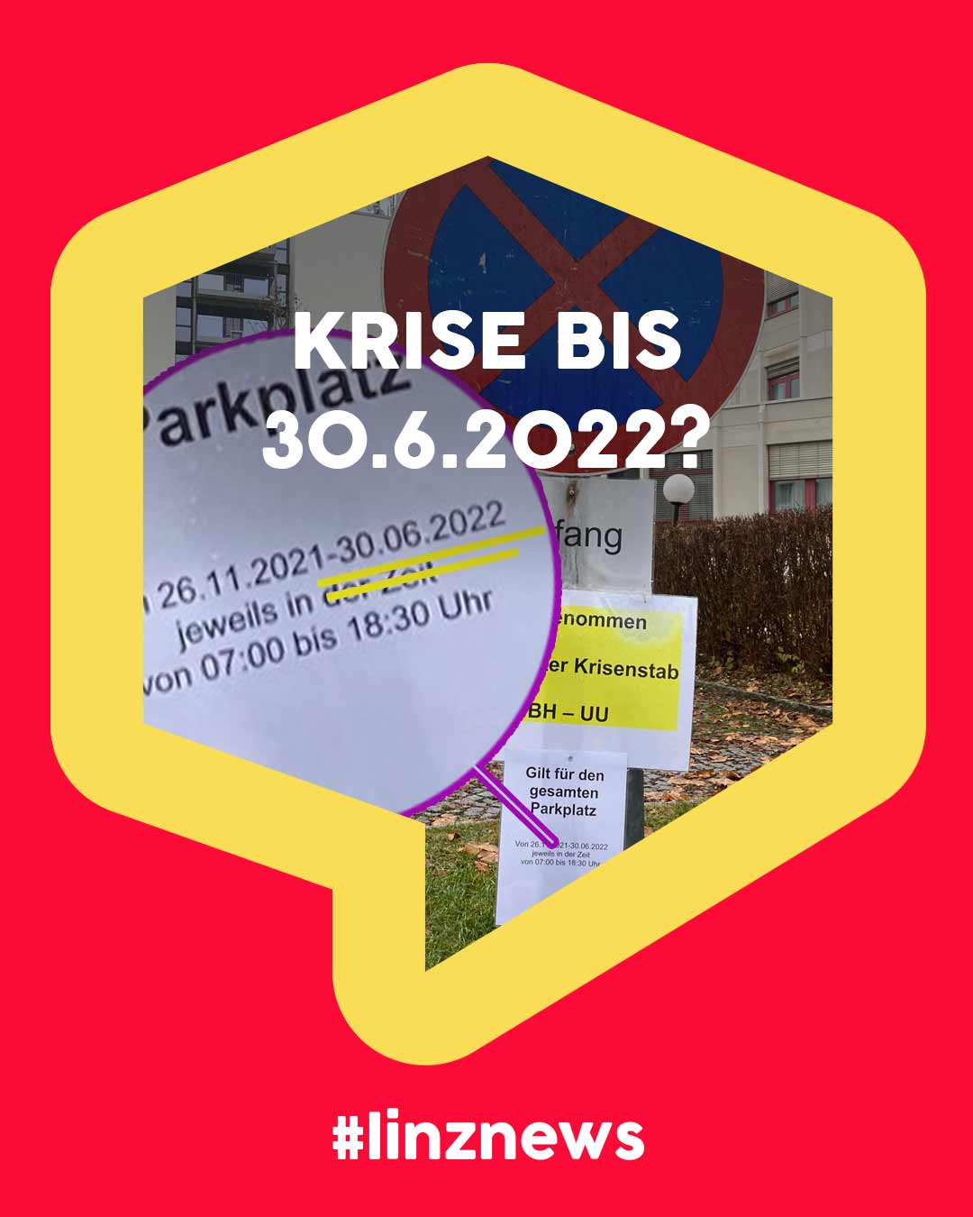 Landeshauptmann Thomas Stelzer wollte in den letzten Tagen kein Datum für das Ende des Lockdowns oder gar der Pandemie nennen. Die Bezirkshauptmannschaft Urfahr-Umgebung in der Peuerbachstraße hat jetzt aber laut Aushang Fakten geschaffen. Die Parkplätze für die Mitarbeiter des Krisenstabes wurden bereits bis zum 30. Juni 2022 reserviert!