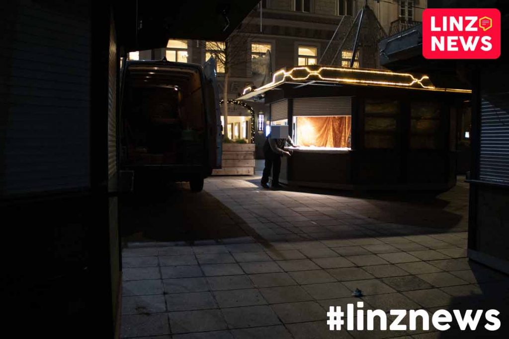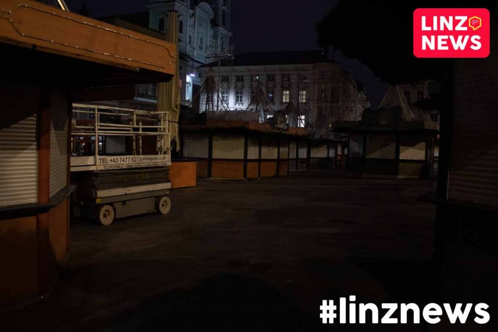 Einige Beschicker bereiteten die Stände am Linzer Hauptplatz auch nach der Verkündigung der Verschärfungen samt Lockdown ab Montag am gestrigen Abend noch vor. Waren blieben derweilen aber eher in Kisten und Kartons.