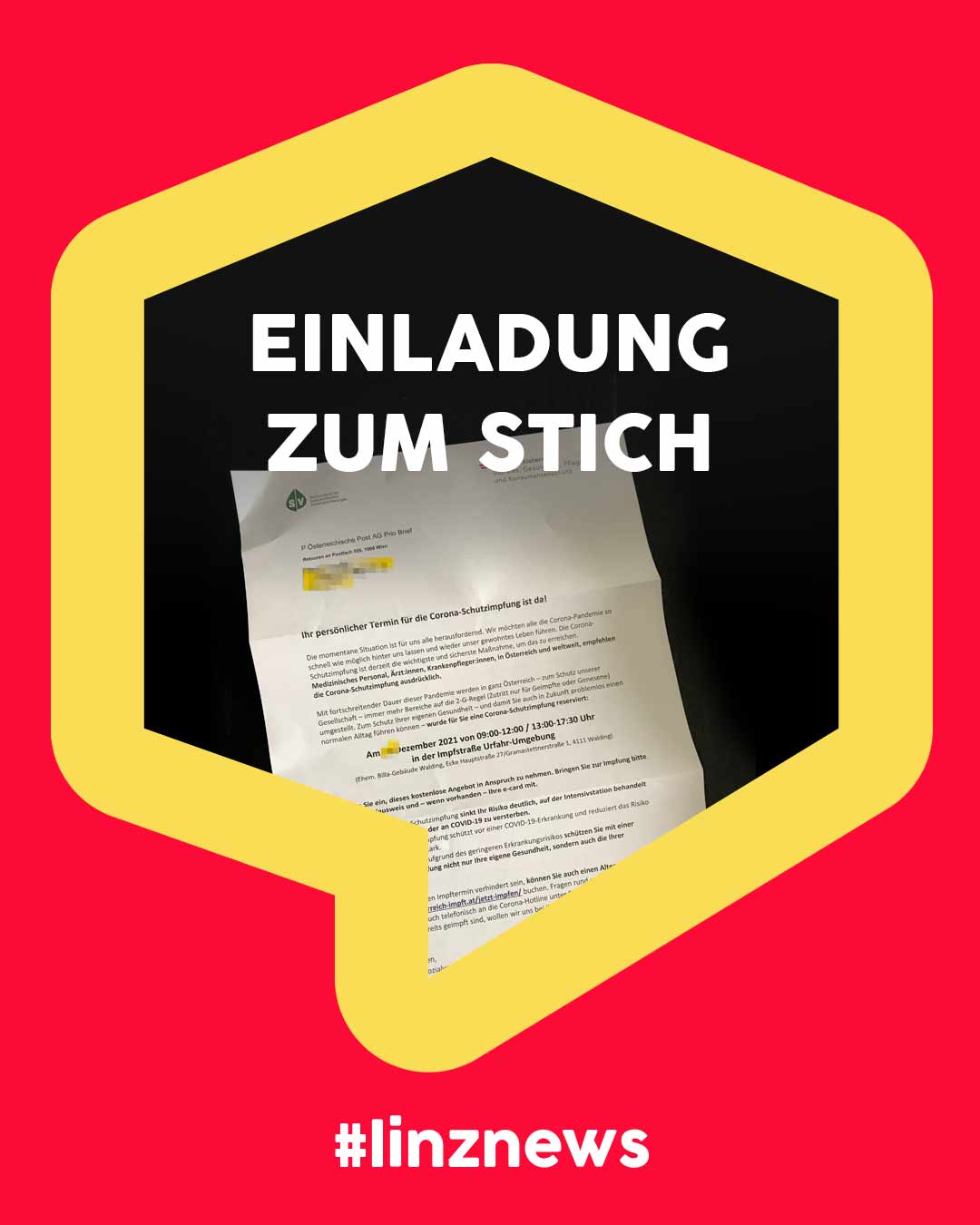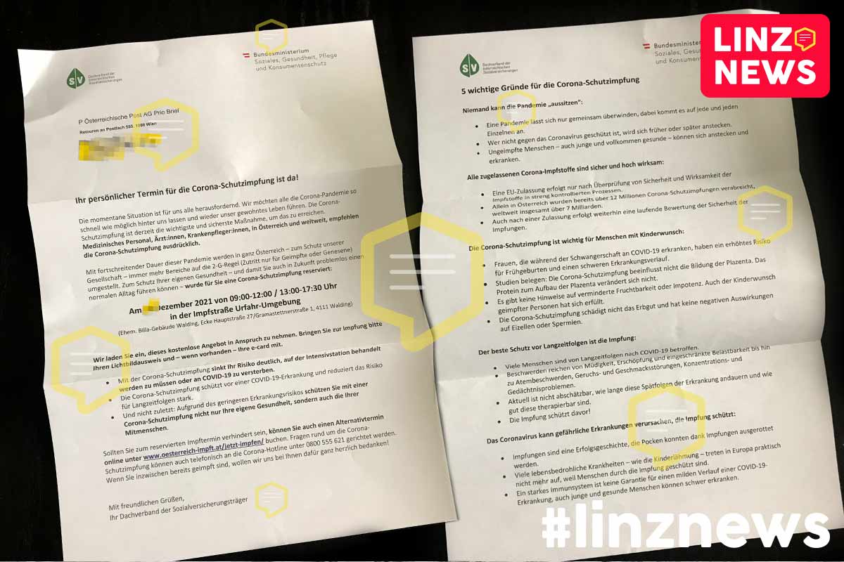 Heute haben die ersten nicht geimpften Menschen in Linz, die älter als 18 Jahre sind, Post von der Sozialversicherung bzw. vom Gesundheitsministerium erhalten.
