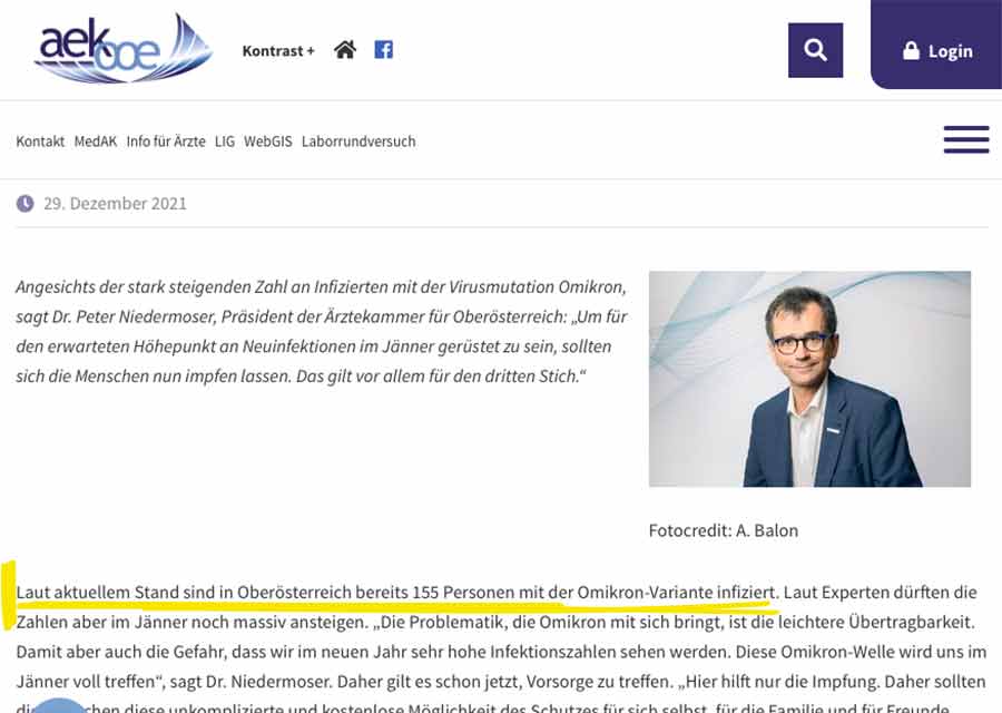 Dr. Peter Niedermoser (Präsident der Ärztekammer für Oberösterreich) spricht auf der Website der Ärztekammer heute von der kommenden “Omikron-Welle” und der “stark steigenden Zahl an Infizierten”.