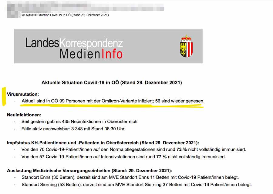 Konkret wird berichtet: “Laut aktuellem Stand sind in Oberösterreich bereits 155 Personen mit der Omikron-Variante infiziert”.