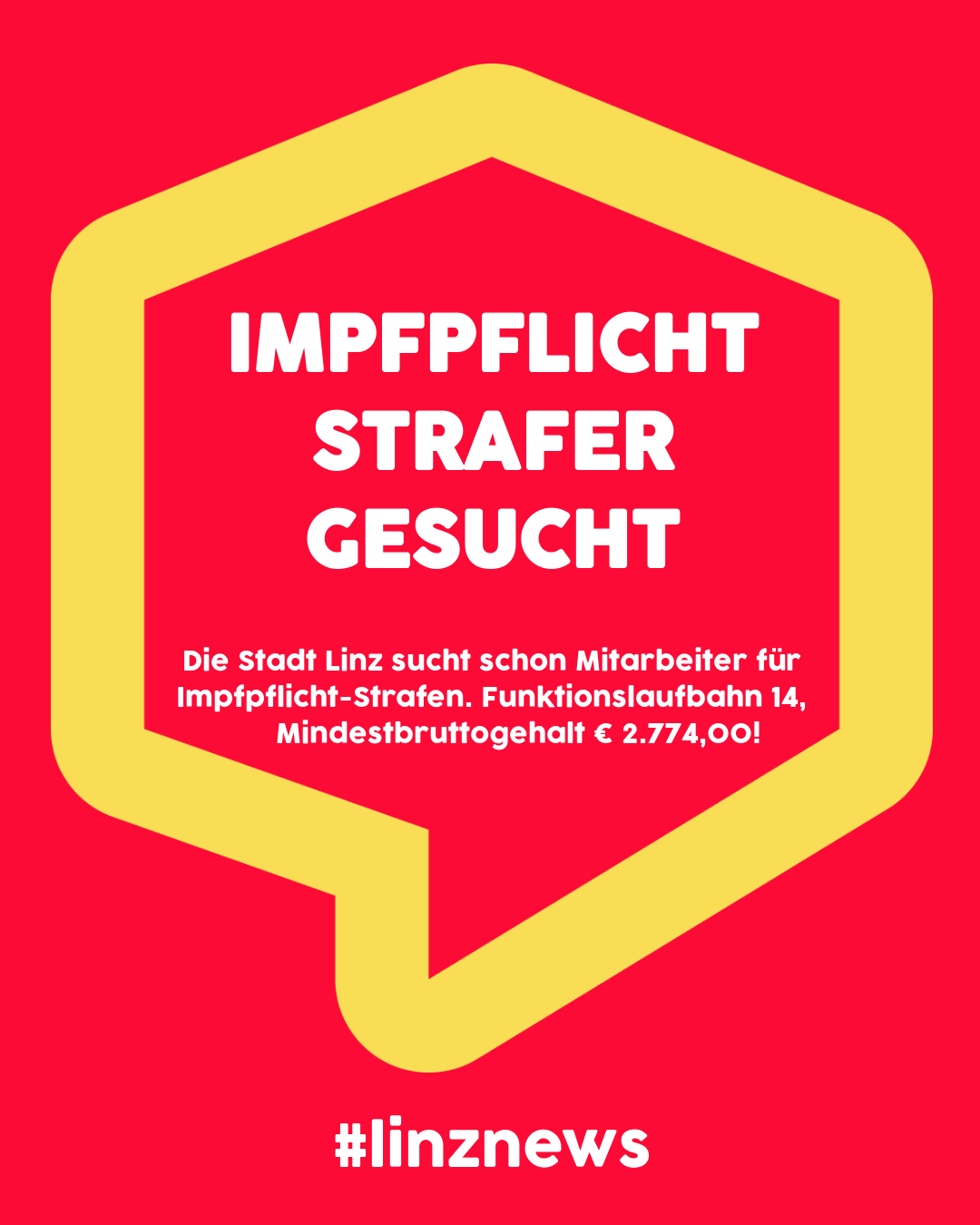 Die geplante Impfpflicht wirft nun am Jobmarkt erste Schatten voraus! Die Stadt Linz sucht derzeit “MitarbeiterInnen Verwaltungsstrafen, Abgaben und Steuern” mit einer Entlohnung nach Funktionslaufbahn 14 (Mindestbruttogehalt € 2.774,00) im Beschäftigungsausmaß “Vollzeit”.