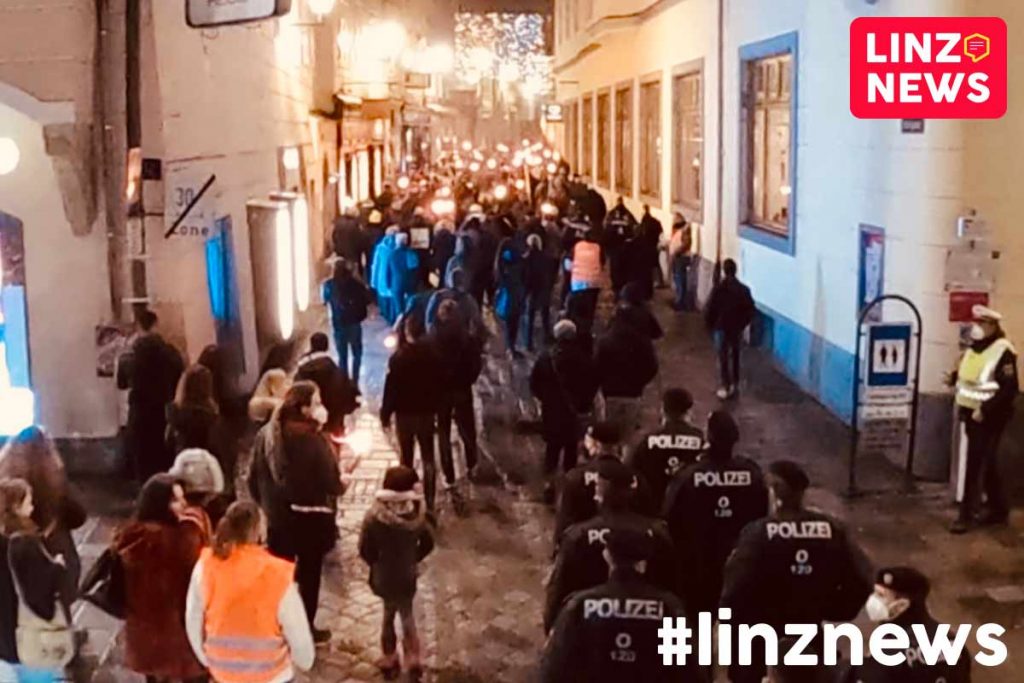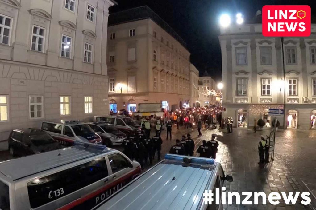 Seit etwa 17:45 läuft ein Fackelzug durch die Linzer Innenstadt. Die Versammlung bewegt sich später noch via Römberbergtunnel und Nibelungenbrücke bis auf das Jahrmarktgelände in Urfahr.