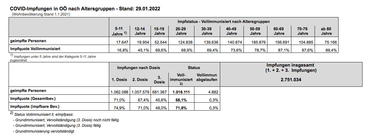 Zum Stand 29.1.2022 weist OÖ eine Impfquote von 68,1% der Gesamtbevölkerung bzw. 71,8% der impfbaren Bevölkerung aus.