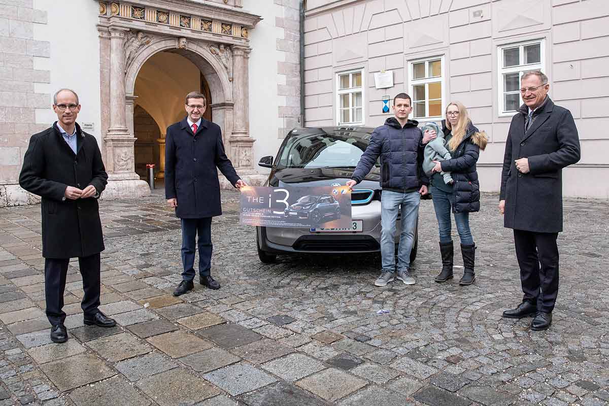 Er hat nach eigenen Angaben noch nie bei einem Gewinnspiel gewonnen – und nun ist der 29jährige Manuel K. aus St. Marienkirchen am Hausruck dank der OÖ. Impflotterie bald stolzer Besitzer eines Elektro-BMW: Der BMW i3 in einer Sonderausgabe, die weltweit auf 2.000 Stück limitiert ist, wurde dem glücklichen Gewinner des Hauptpreises von ‚G’impft gewinnt‘, der Impflotterie des Landes OÖ, heute vor dem Linzer Landhaus von Landeshauptmann Mag. Thomas Stelzer, Wirtschafts-Landesrat Markus Achleitner und Dr. Alexander Susanek, Geschäftsführer vom BMW Group Werk Steyr, das diesen besonderen Preis zur Verfügung gestellt hat, symbolisch übergeben. Symbolisch deshalb, weil dieser BMW i3 eDrive in der Unique Forever Edition in der Sonderfarbe Stormbay Grey als Sonderanfertigung derzeit noch in Produktion ist – was der Freude des Gewinners über den Hauptpreis aber keinen Abbruch tat.