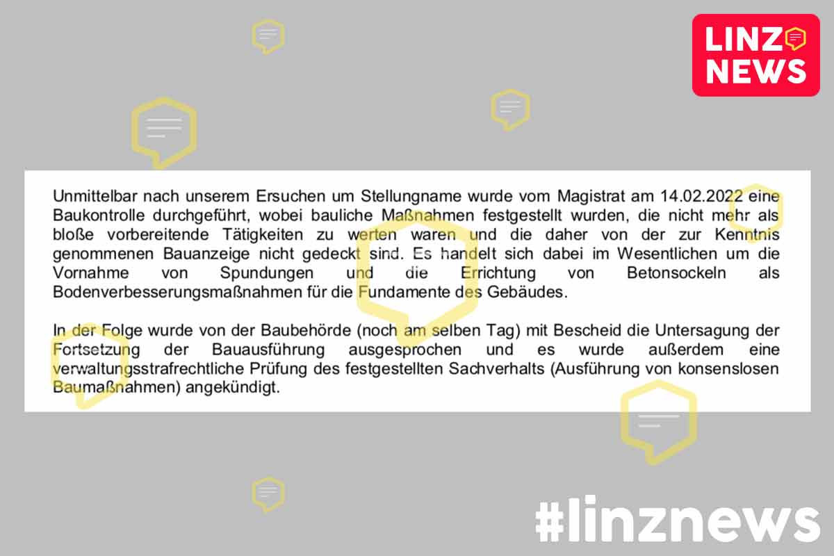 Die “Untersagung der Fortsetzung der Bauausführung” – umgangssprachlich Baustopp – wurde vom Magistrat Linz dem Land OÖ bestätigt. Dies geht aus dem Schreiben zur Enderledigung eindeutig hervor: