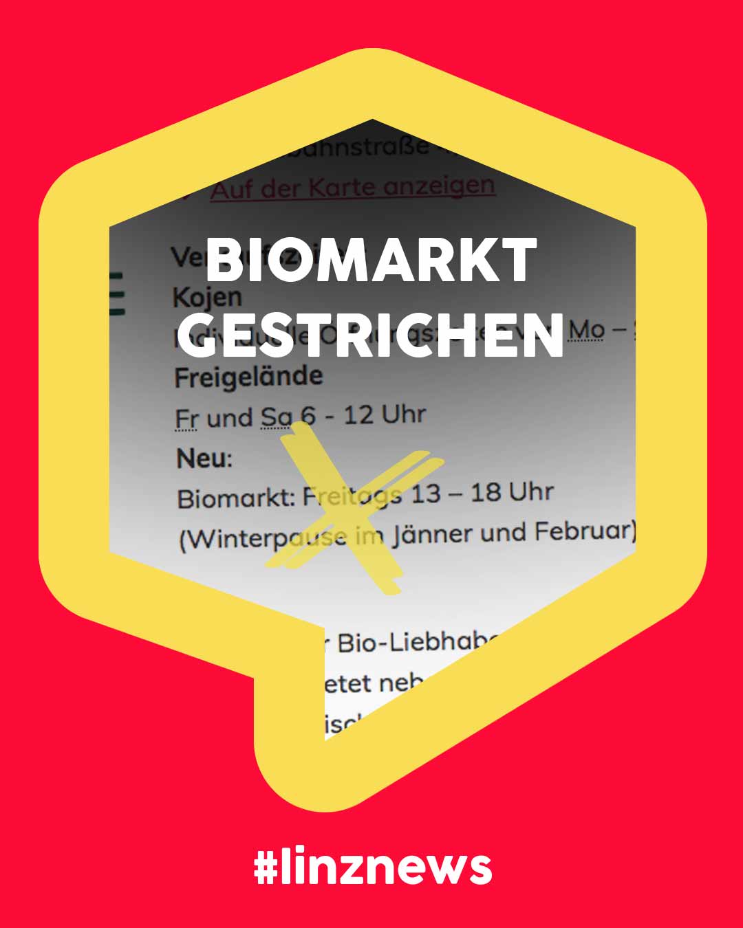 Der Freitagsmarkt am Nachmittag wurde einfach von der Website der Stadt Linz gelöscht (Screenshot anbei) und der letzte verbliebene Werbeaufkleber abgekratzt. Ganz ohne Ankündigung, ohne werbliche Begleitmaßnahmen und ohne Presseaussendung oder sonstiger Aktivität. Es gab auch keine Pressekonferenz und lobende Worte der Politik!
