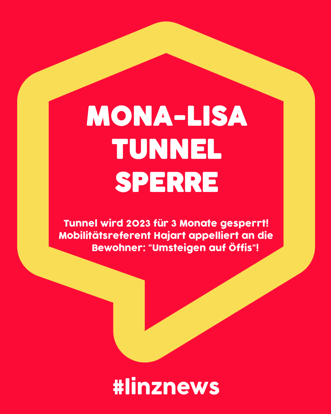„Da es sich beim Mona Lisa Tunnel um eine neuralgische Verkehrsverbindung in den Süden von Linz handelt, würde es hier in Spitzenzeiten ohne entsprechende Alternativen zu enormen Verkehrsstaus kommen. Es kommt daher darauf an, die Bevölkerung rechtzeitig vorzubereiten. So sollten nach Möglichkeit öffentliche Verkehrsmittel benützt werden. Mit der Straßenbahn ist während der gesamten Bauzeit von drei Monaten ein rasches und staufreies sowie von Bauarbeiten unbeeinträchtigtes Erreichen Ihrer Wohngebiete im Süden von Linz möglich. Für jene Verkehrsteilnehmerinnen und Verkehrsteilnehmer, die unbedingt auf das Auto angewiesen sind, kommt es darauf an, Umfahrungsmöglichkeiten zu schaffen“, informiert Mobilitätsreferent Martin Hajart und appelliert an die Bewohner, die im Sommer 2023 bestehenden Alternativen in Anspruch zu nehmen.