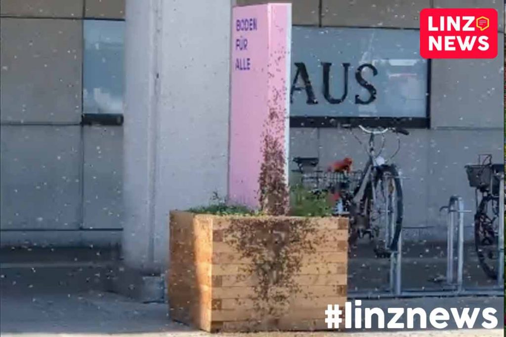 LINZ. Bienenschwarm besiedelte Werbetafel vor Neuem Rathaus!
