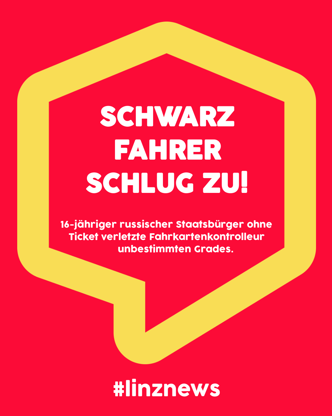 Ein junger Mann ohne Ticket schlug dem Fahrkartenkontrolleur ohne Vorwarnung mit der Faust ins Gesicht und verletzte diesen unbestimmten Grades. Am 28. Juni 2022 gegen 8:00 Uhr führten die zwei Fahrkartenkontrolleure Kontrollen in der Straßenbahn in der Stadt Linz durch. Dabei wurde ein 16-jähriger russischer Staatsbürger einer Kontrolle unterzogen. Dieser weigerte sich jedoch seinen Fahrausweis auszuhändigen.
