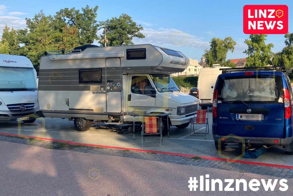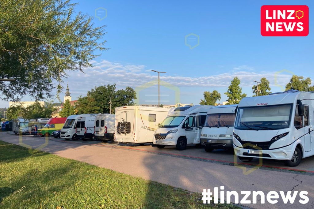 OVERTOURISM! Erneut dichtes Gedränge und Stoßstange an Stoßstange am Urfahrmarkt. In Wohnmobilen, Bullis und anderen umgebauten Gefährten nächtigen dutzende Menschen am sogenannten “AEC-Parkplatz”.