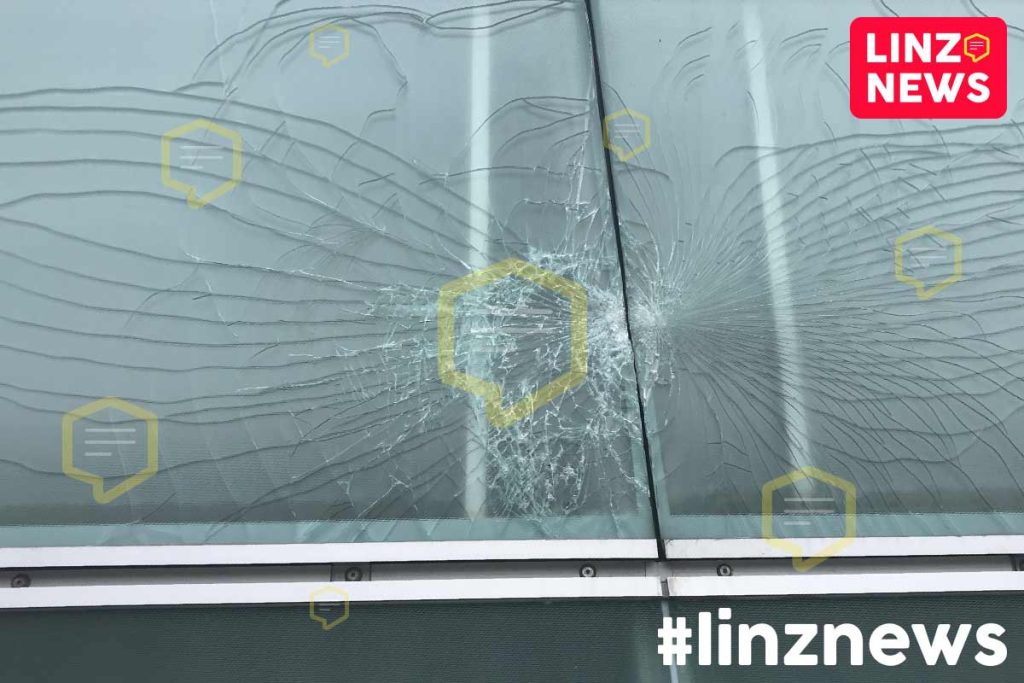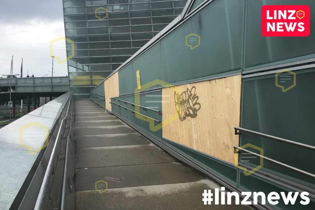JÖSSAS! Da ist vermutlich keine Taube gegen die Fassade geflogen! Gleich an mehreren Stellen der nachts leuchtenden Fassade des Ars Electronica Centers sind große Schäden zu sehen. Beim Aufgang zum Vorplatz – dem Maindeck – wurden ganze Glaselemente mit Sperrholz zugeplankt.