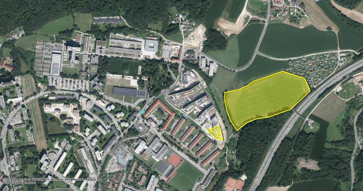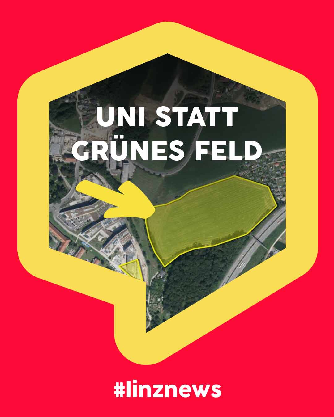 NA BUM! Innovativ und digital soll sie sein diese neue Uni. Vorerst wird sie aber ein Bodenversiegeler und Grünraum-Killer! Gleich ein ganzes Feld im Auhof wird für das Vorhaben benötigt.