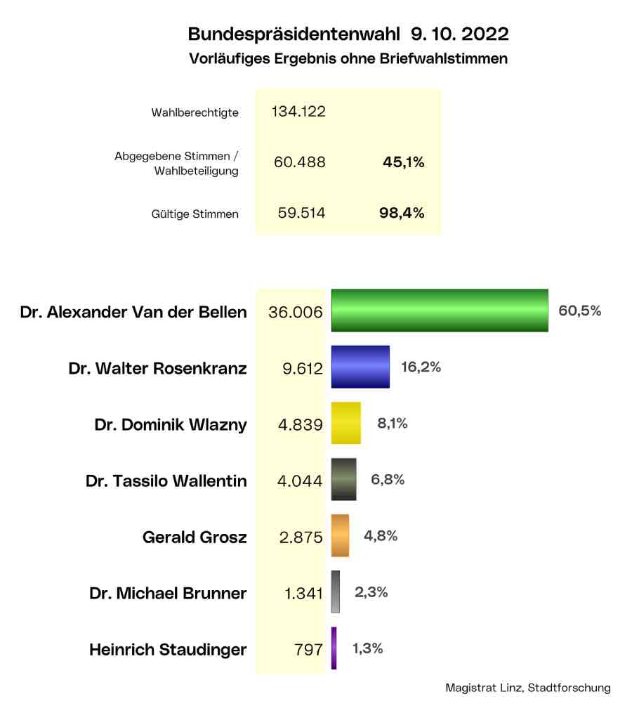 Vorläufiges Ergebnis zur Bundespräsidentenwahl 2022 der Landeshauptstadt Linz am 9. Oktober 2022