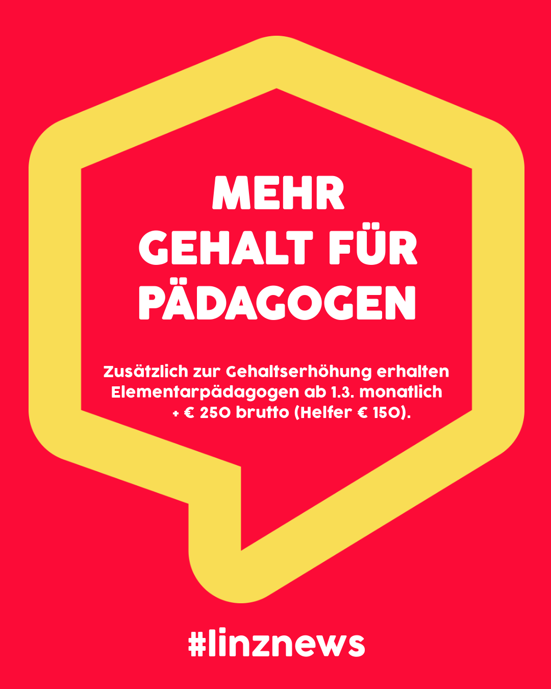 Zusätzlich zu den Gehaltserhöhungen durch die Übernahme des Gehaltsabschlusses für öffentliche Bedienstete erhalten aus diesem Grund ElementarpädagogInnen künftig monatlich plus 250 Euro brutto in allen Gehaltsstufen und HelferInnen künftig monatlich plus 150 Euro brutto in allen Gehaltsstufen. (wirksam ab 01.03.2023)
