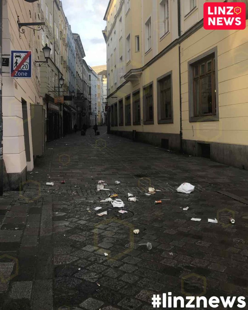 Trotz dutzender Mistkübel scheinen die nächtlichen Besucher der Innenstadt sämtliche Abfälle einfach auf den Boden fallen zu lassen. Einen erkennbaren Zulauf bei den eigentlich dafür vorgesehenen Kübeln scheint es nicht zu geben.