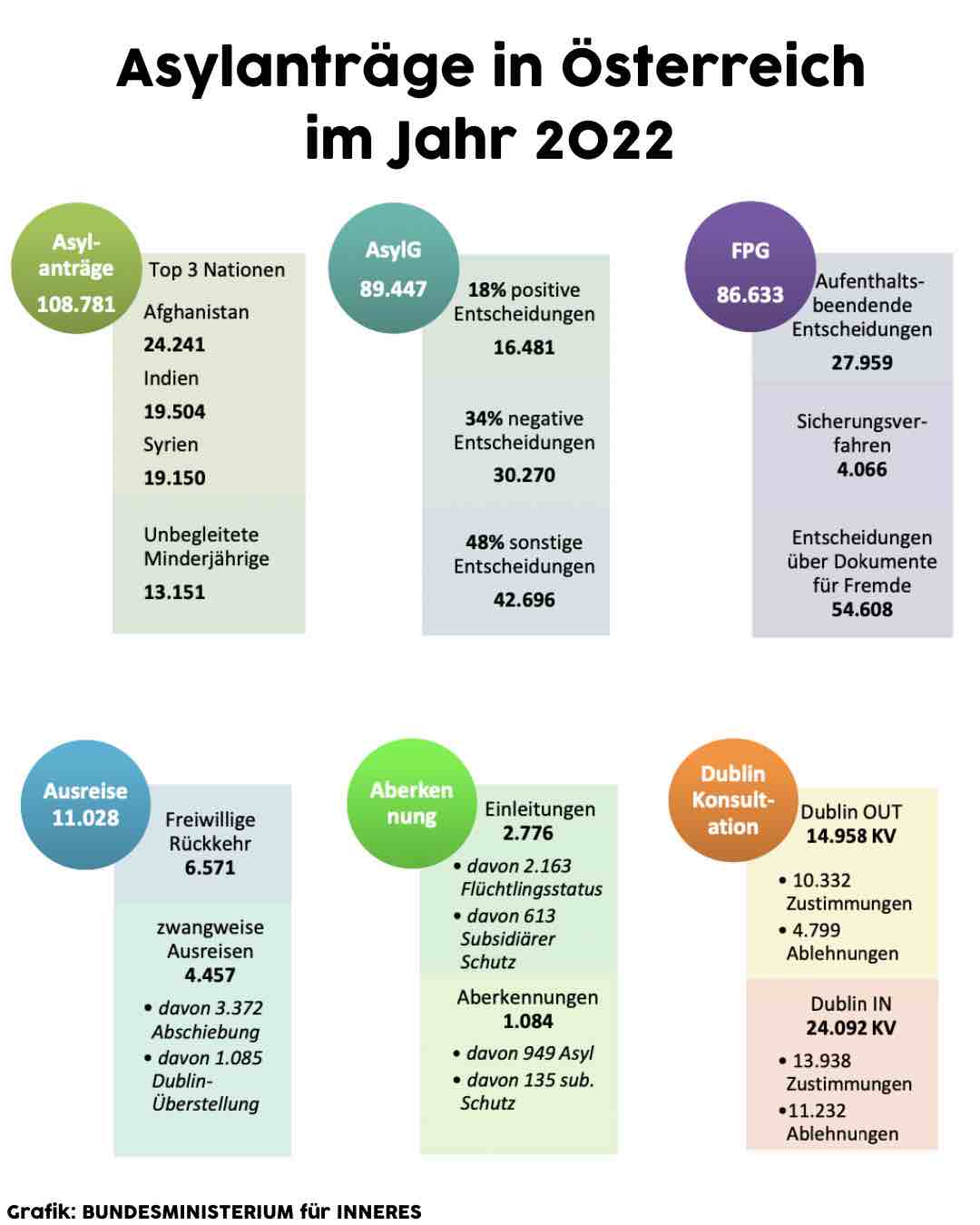 Unmittelbar nach der Niederösterreich-Wahl hat das Innenministerium die detailierten Statistiken zu Asylanträgen in Österreich im Jahr 2022 veröffentlicht.