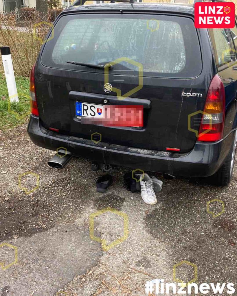 Laut Beobachtern kam die Gruppe in einem Kombi angefahren. Das Auto hat ein Kennzeichen aus der Slowakei, dürfte aber laut Kennzeichenhalterung irgendwann in Deutschland (Kerpen) unterwegs gewesen sein.
