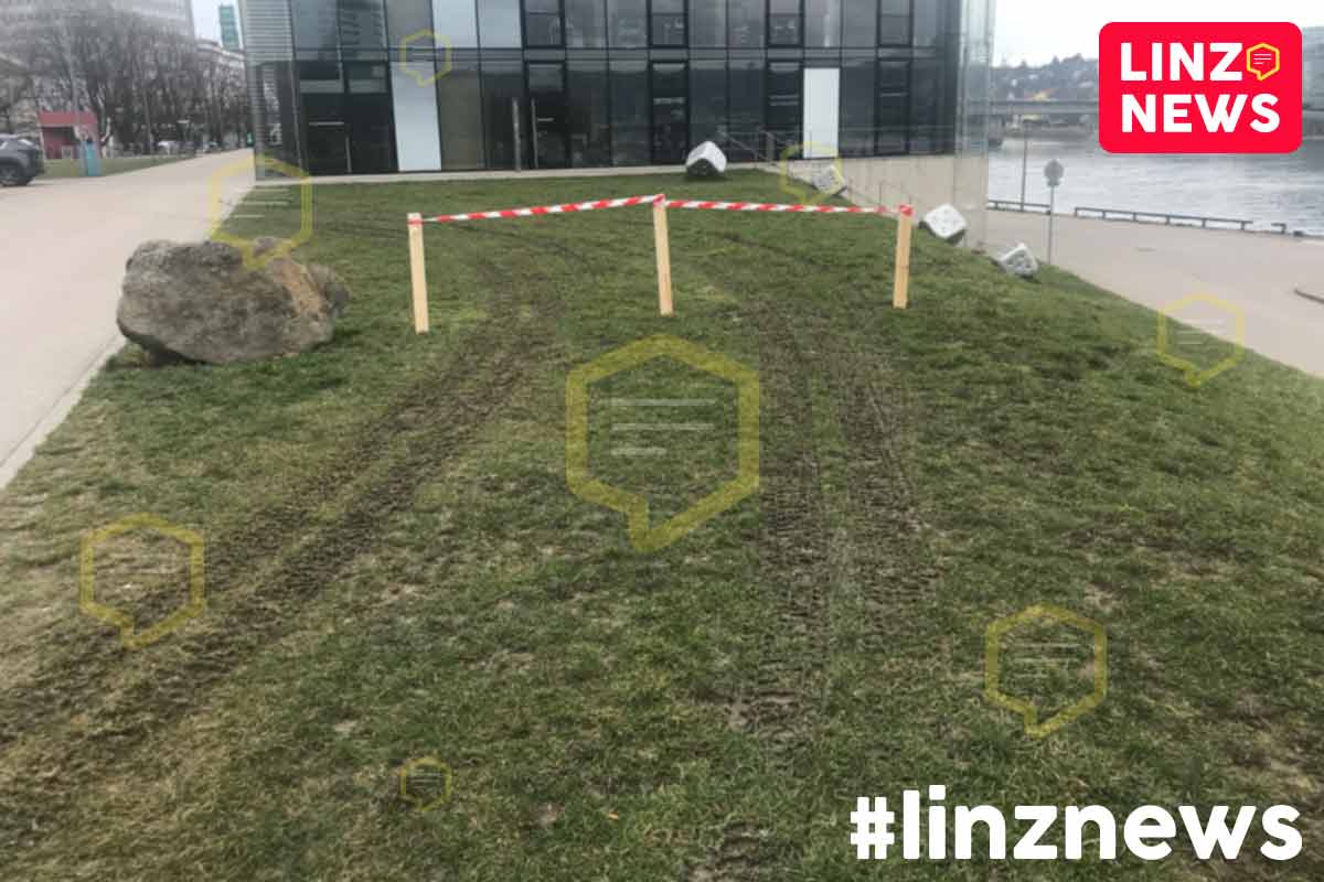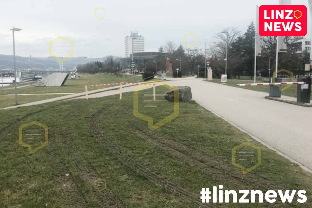 Einige Fahrzeuge ruinierten nun aber auch die Grünanlage im Donaupark direkt bei der Zufahrt. Die Schrankenanlage wird einfach umfahren. Geblieben sind Reifenspuren.