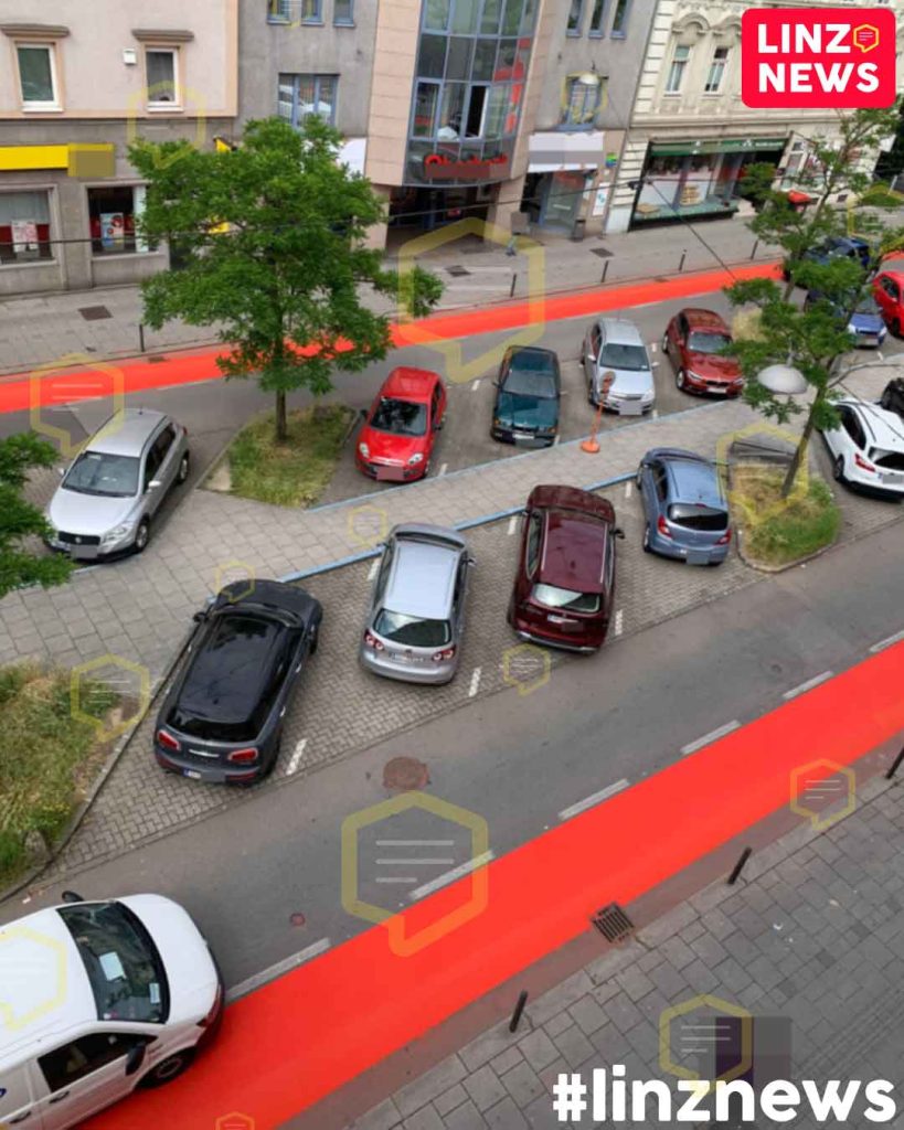 Nach einem roten Streifen in der Stockhofstraße wurde nun die Wiener Straße bemalt. Beidseitig wurde mit der roten Farbe nicht gerade gespart.