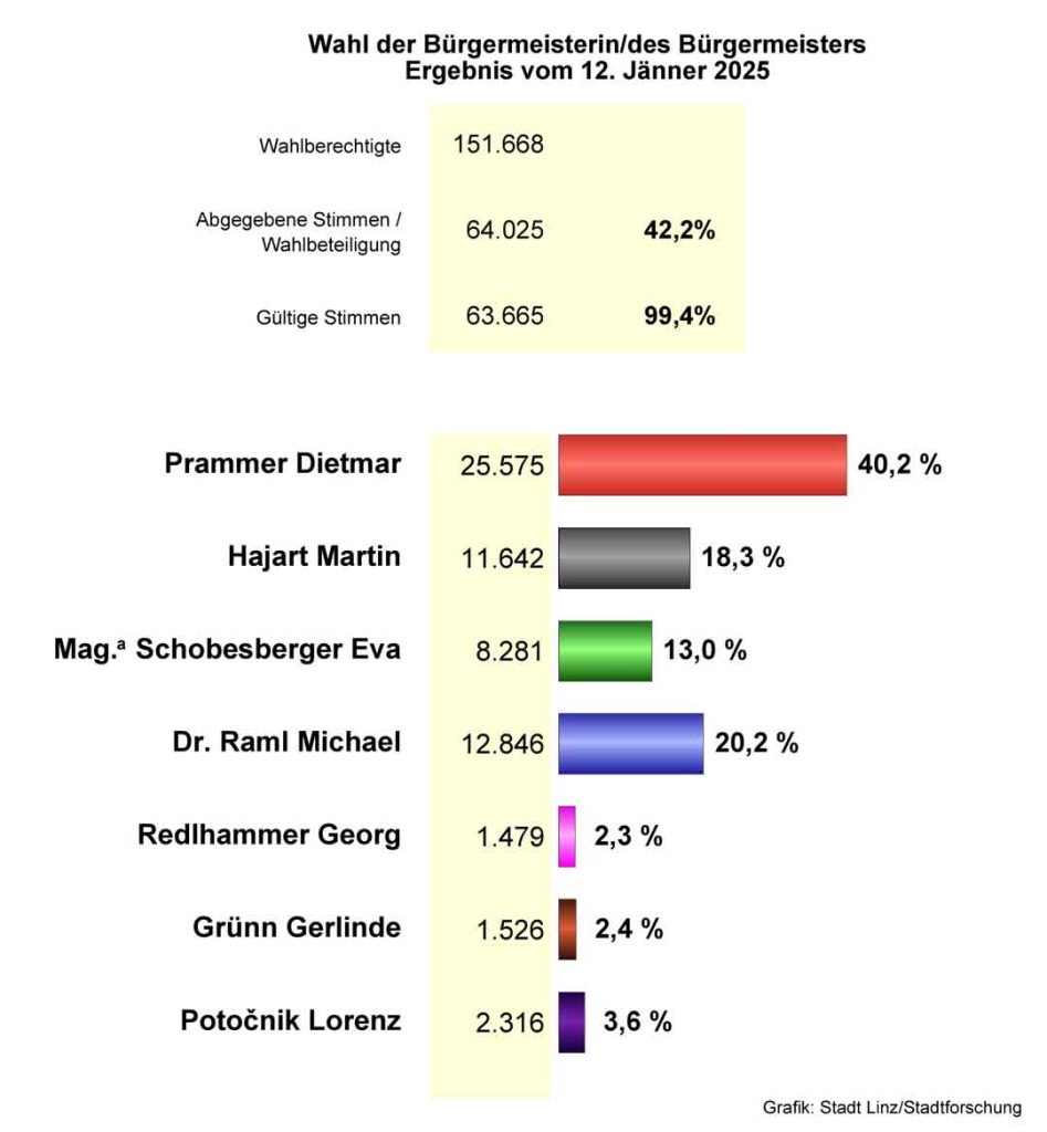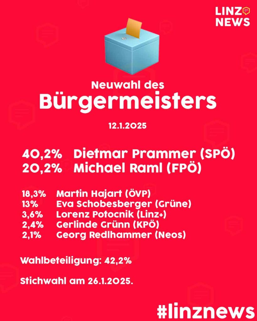 Am 26.1. wird die Stichwahl (engere Wahl des Bürgermeisters) Dietmar Prammer (SPÖ) vs. Michael Raml (FPÖ) lauten.